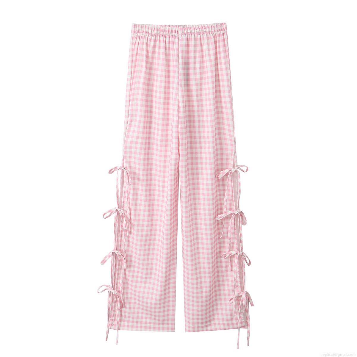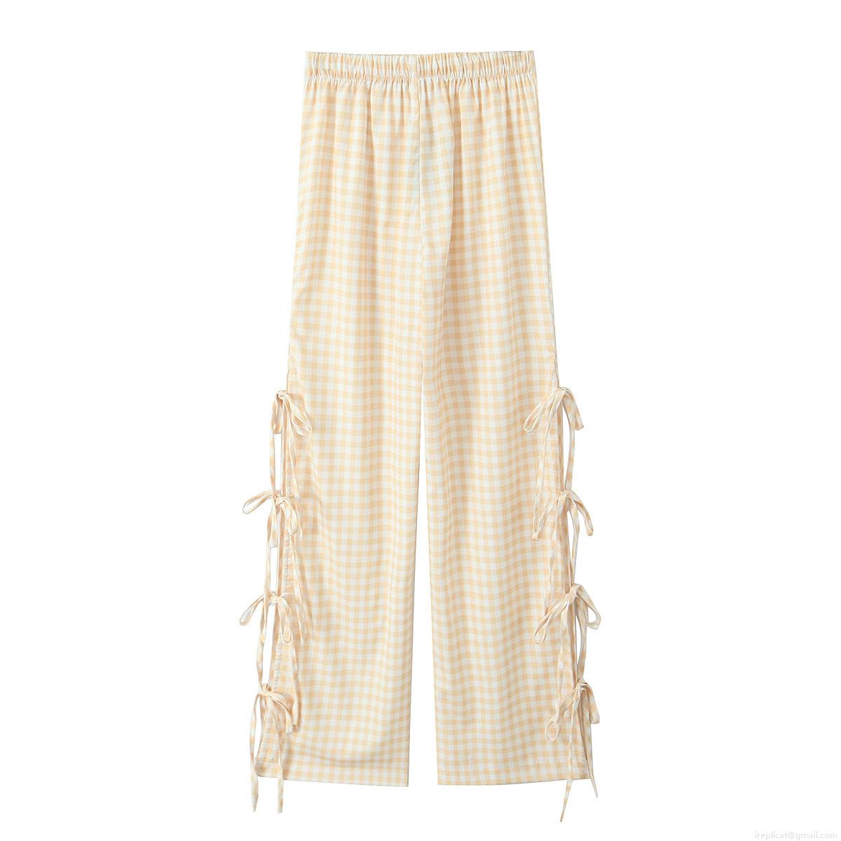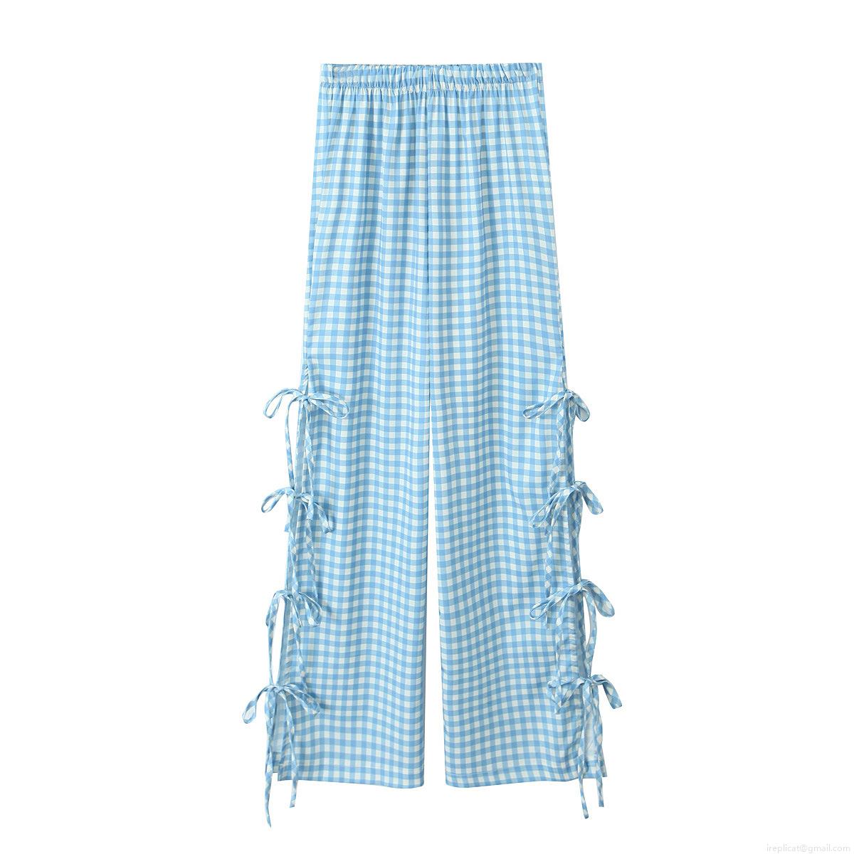 • Women's Plaid Wide Leg Trousers High Waist Elastic Bow Tie Side Casual Straight Long Pants Gingham Striped Streetwear Loose Culottes