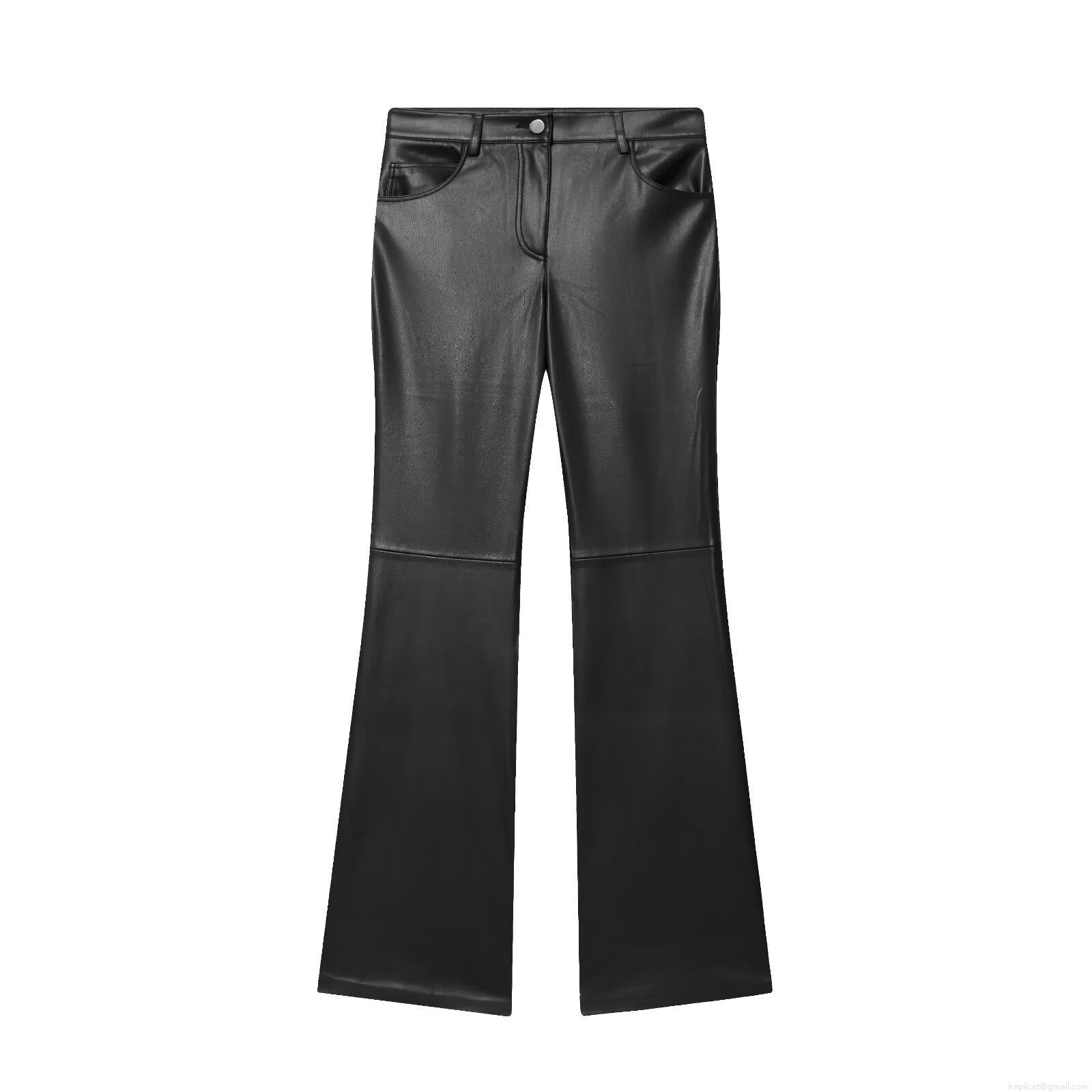 Women's PU Faux Leather Micro-Flare Pants Mid Waist Patchwork Stitched Pockets Streetwear Casual Long Trousers For Lady European Style Fashion Bottoms
