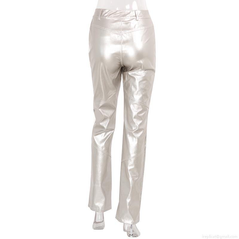 • Women's Silver Metallic Straight Leg Pants High Elastic Faux Leather PU Coated Trousers Streetwear Casual Ankle Length Trousers For Women