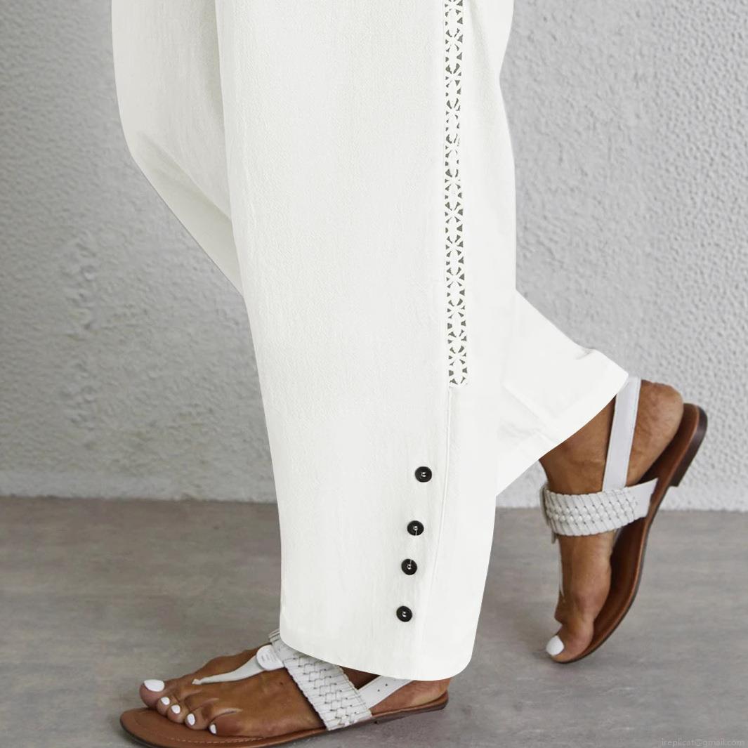 • Women's Wide Leg Casual Pants Cotton Linen Texture Hollow Out Lace Trim Drawstring Elastic Waist Straight Trousers With Side Buttons For Summer Daily Commute Fashion