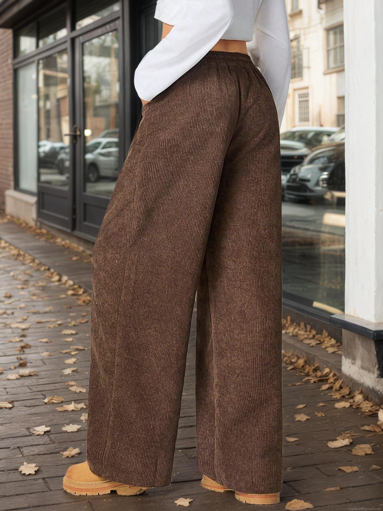 • Women's Wide Leg Pants Corduroy High Waist Elastic Drawstring Casual Loose Trousers For Autumn Winter Streetwear Ladies Deep Brown