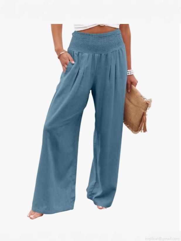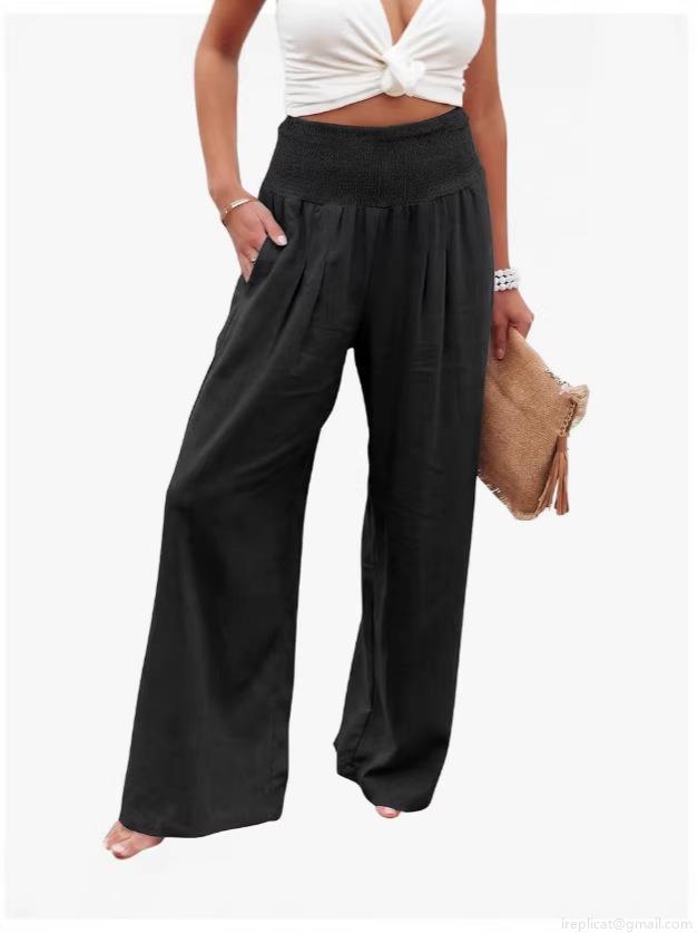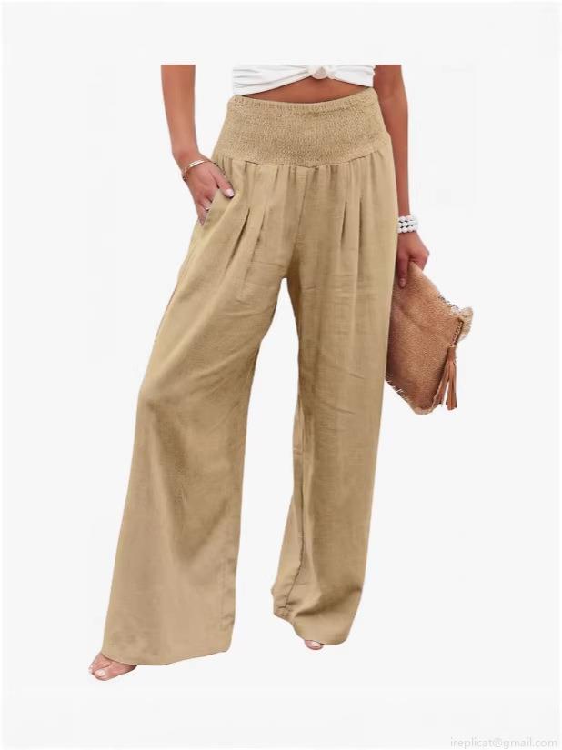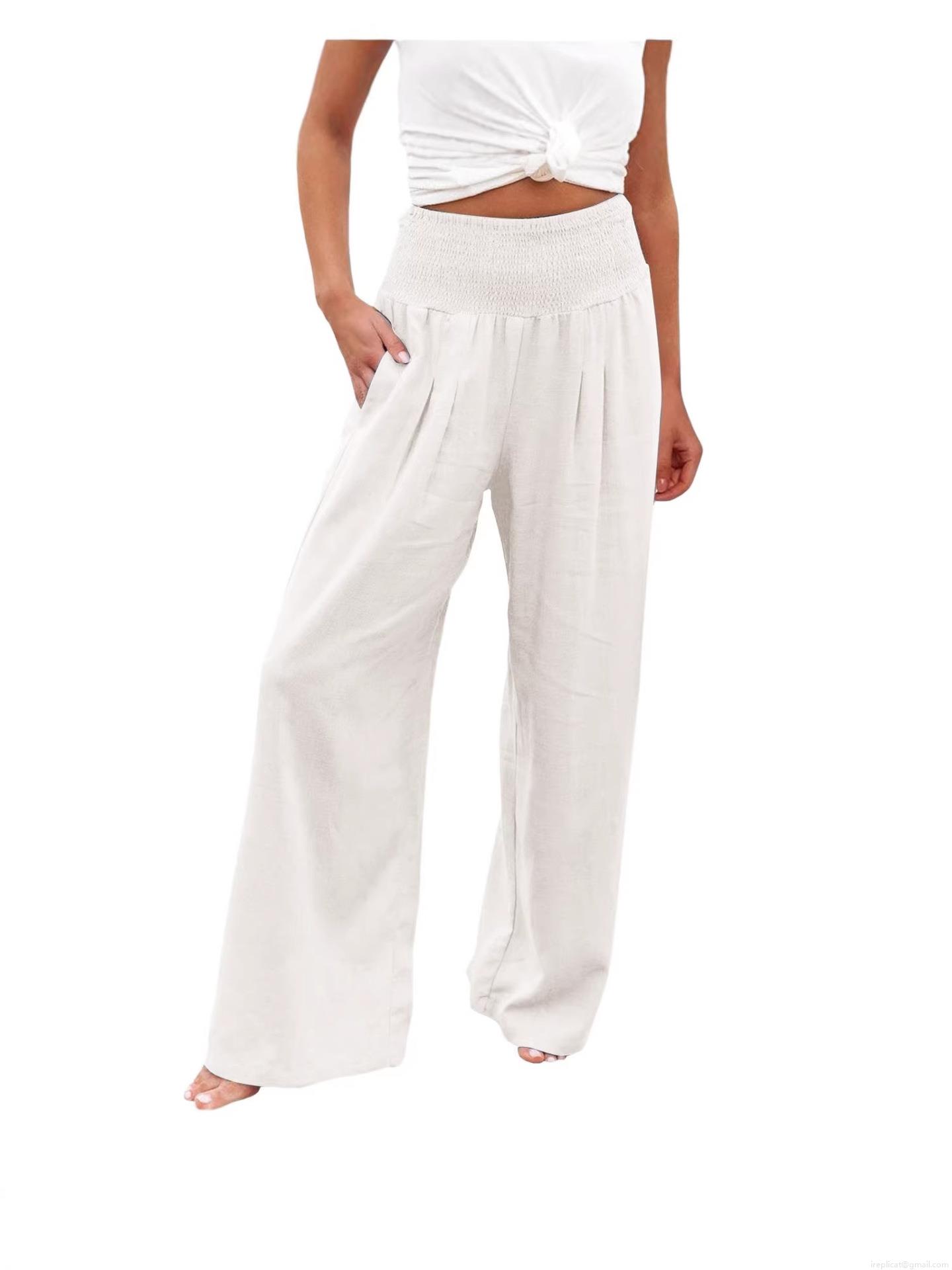 • Women's Wide Leg Pants Cotton Linen Blend High Waist Elastic Smocked Waist Casual Beach Vacation Loose Flowy Solid Color Long Trousers with Pockets