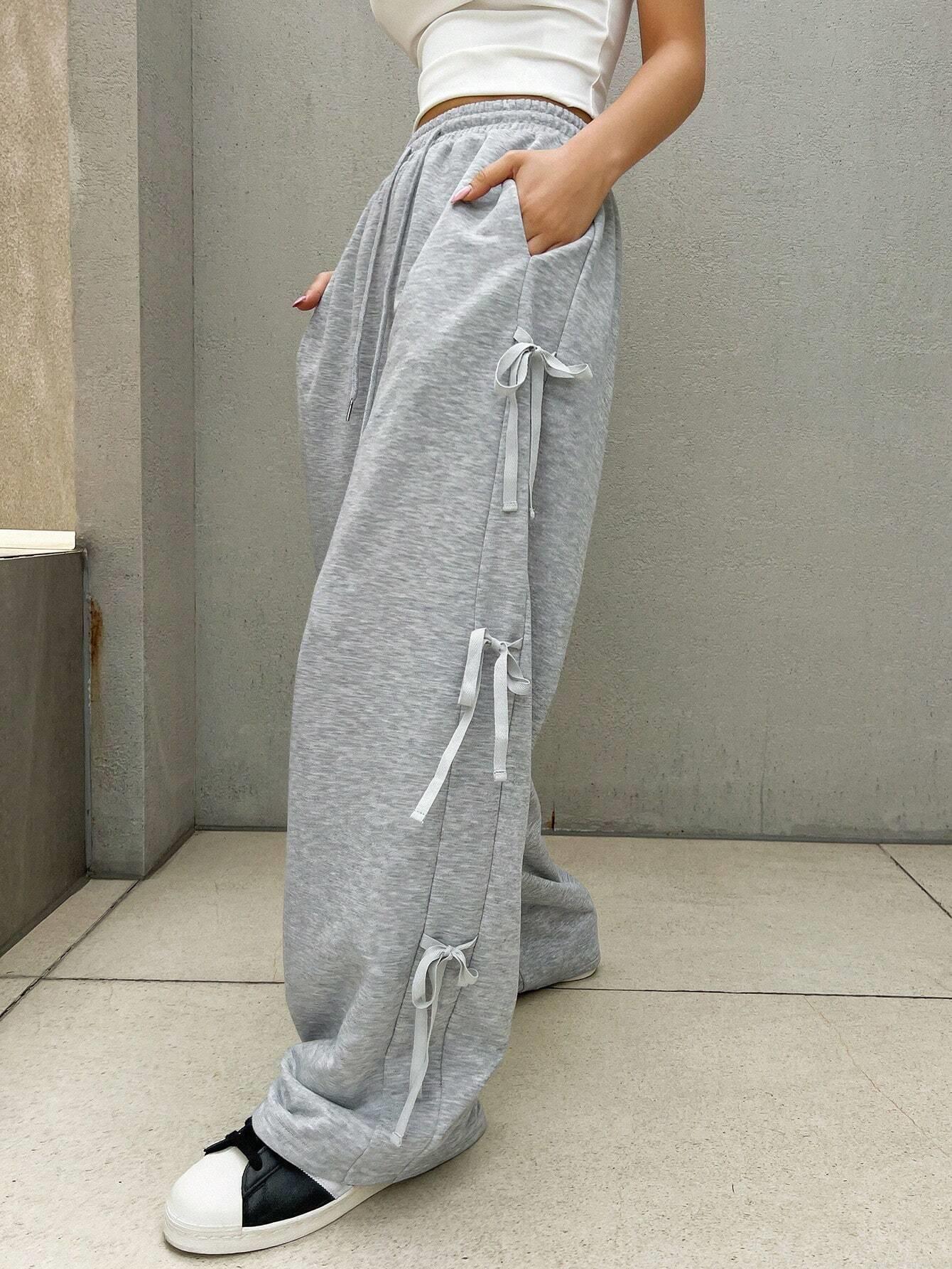 • Women's Wide Leg Sweatpants With Side Ribbon Bows High Waist Baggy Cotton Blend Drawstring Casual Streetwear Harajuku Style Long Pants For Women