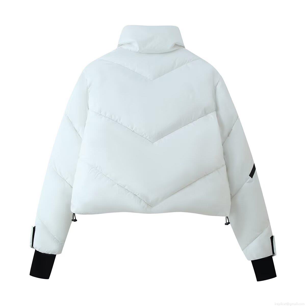 • Women European Street Style Stand Collar Long Sleeve Cotton Padded Jacket Loose Fit Contrast Zipper Winter Warm Puffer Coat With Pockets