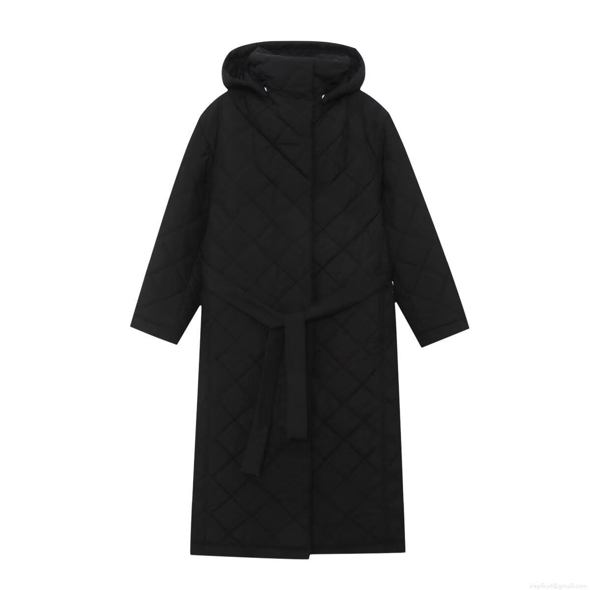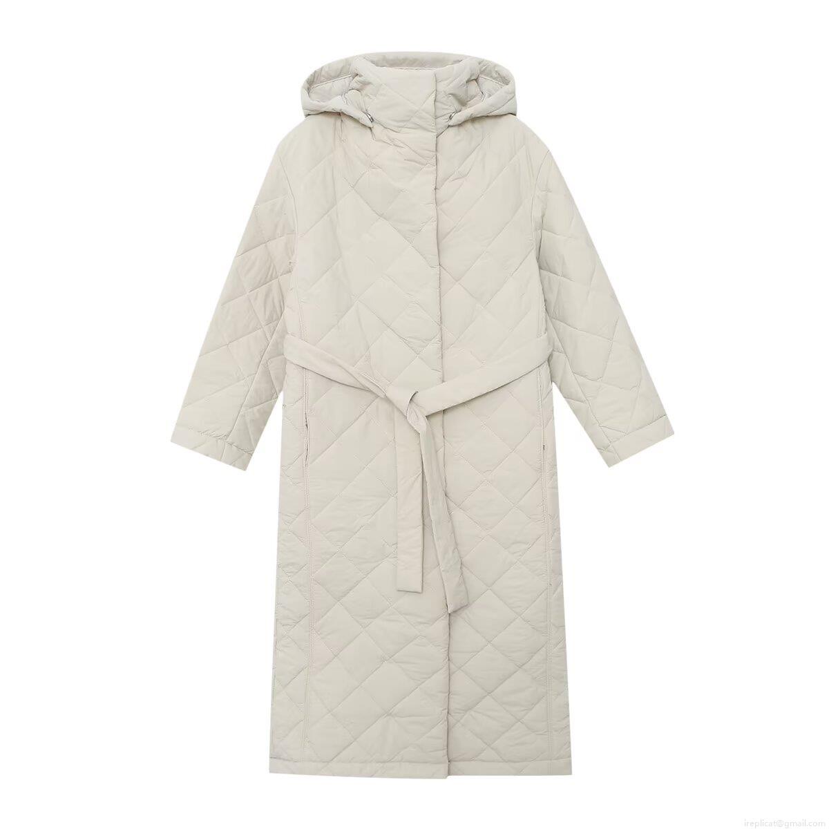 • Women Long Hooded Diamond Quilted Puffer Coat With Belt Solid Color Polyester Padded Winter Jacket Warm Streetwear Outerwear For Women