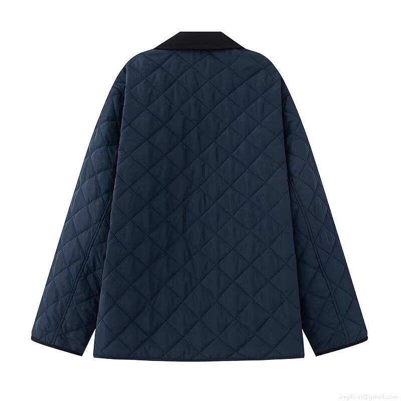 • Women Navy Blue Diamond Quilted Jacket Contrast Corduroy Lapel Single Breasted Padded Coat With Pockets Casual Winter Streetwear Outwear For Women