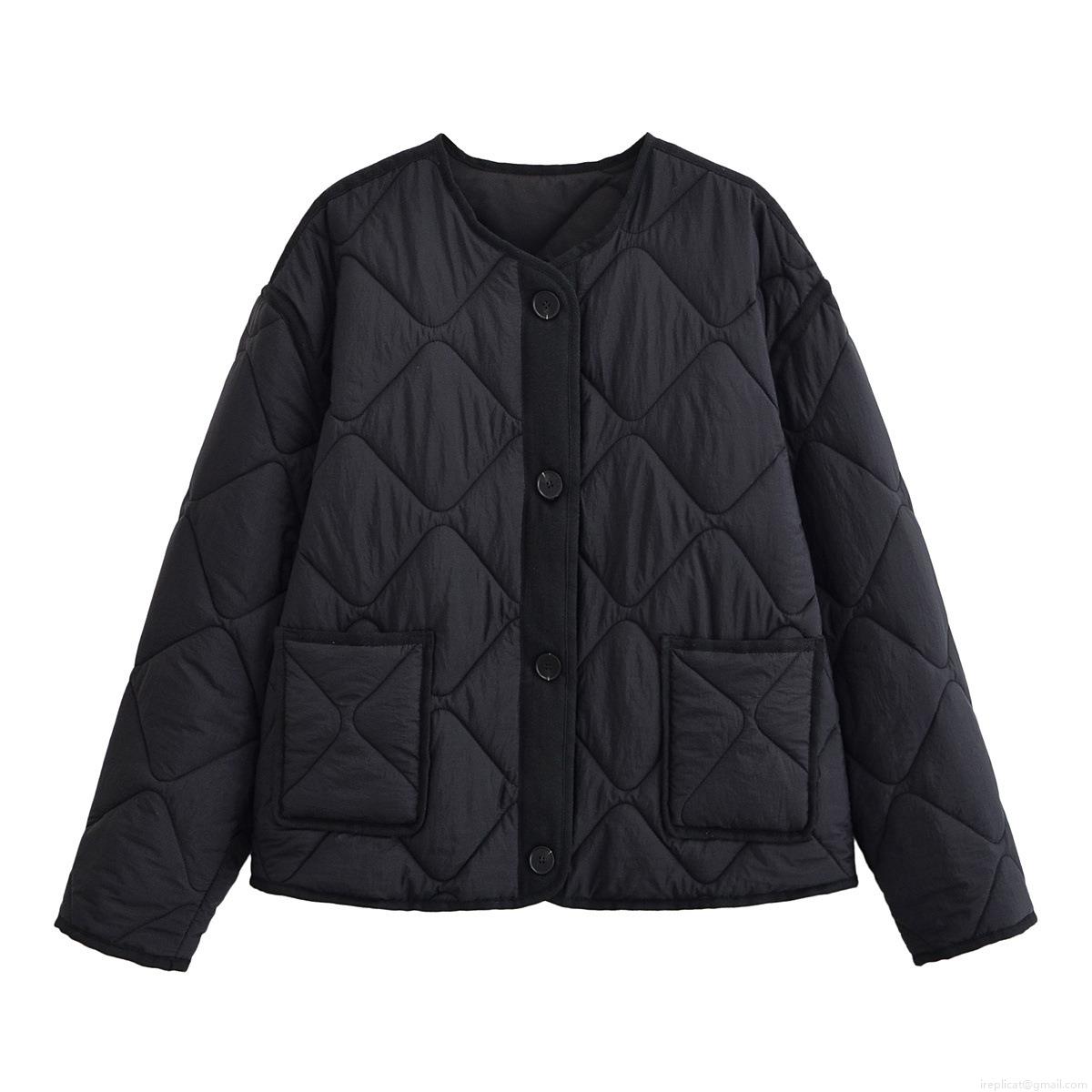 • Women Quilted Rhombus Pattern Lightweight Jacket 100% Polyester Single Breasted Round Neck Puffer Coat For Autumn Winter Streetwear Casual Lady