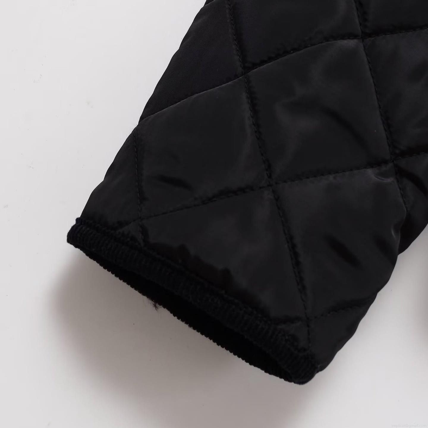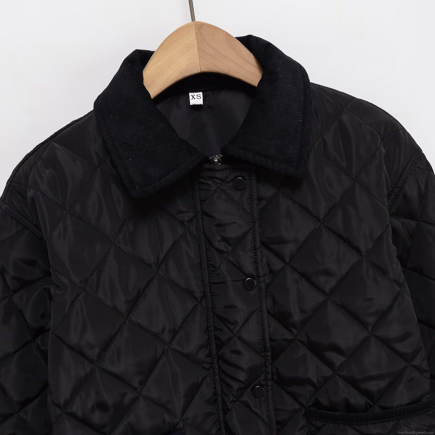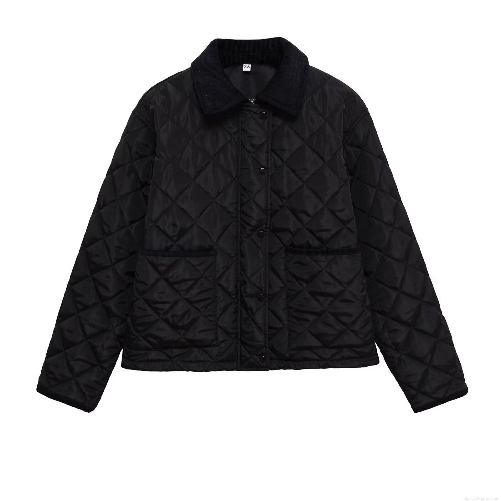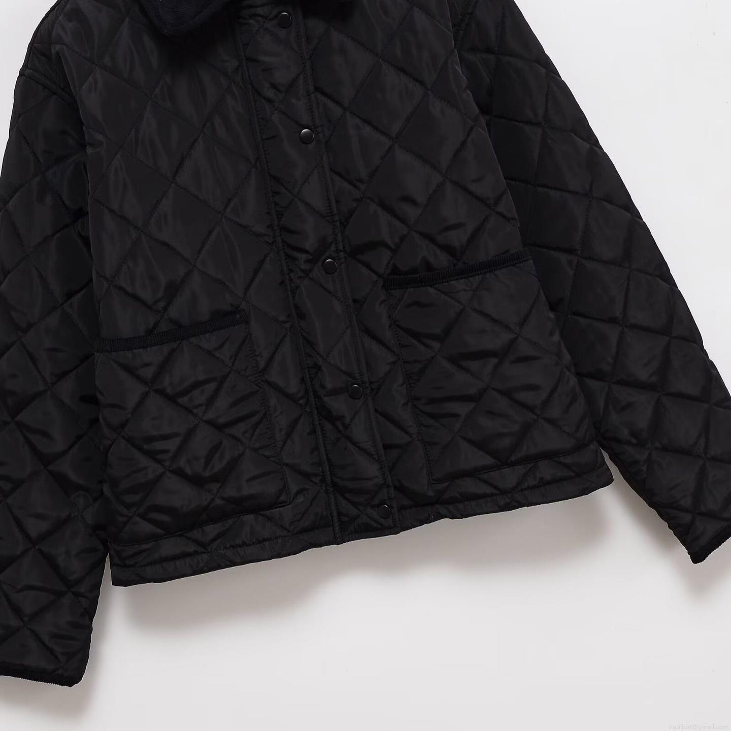 • Women's Casual Quilted Cotton Padded Jacket With Corduroy Collar Black Rhombus Pattern Loose Fit Warm Button Down Coat Outerwear For Women