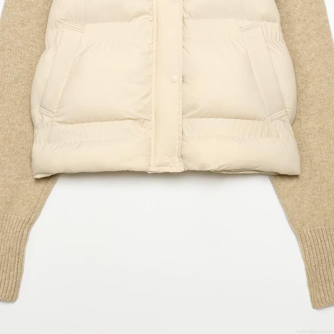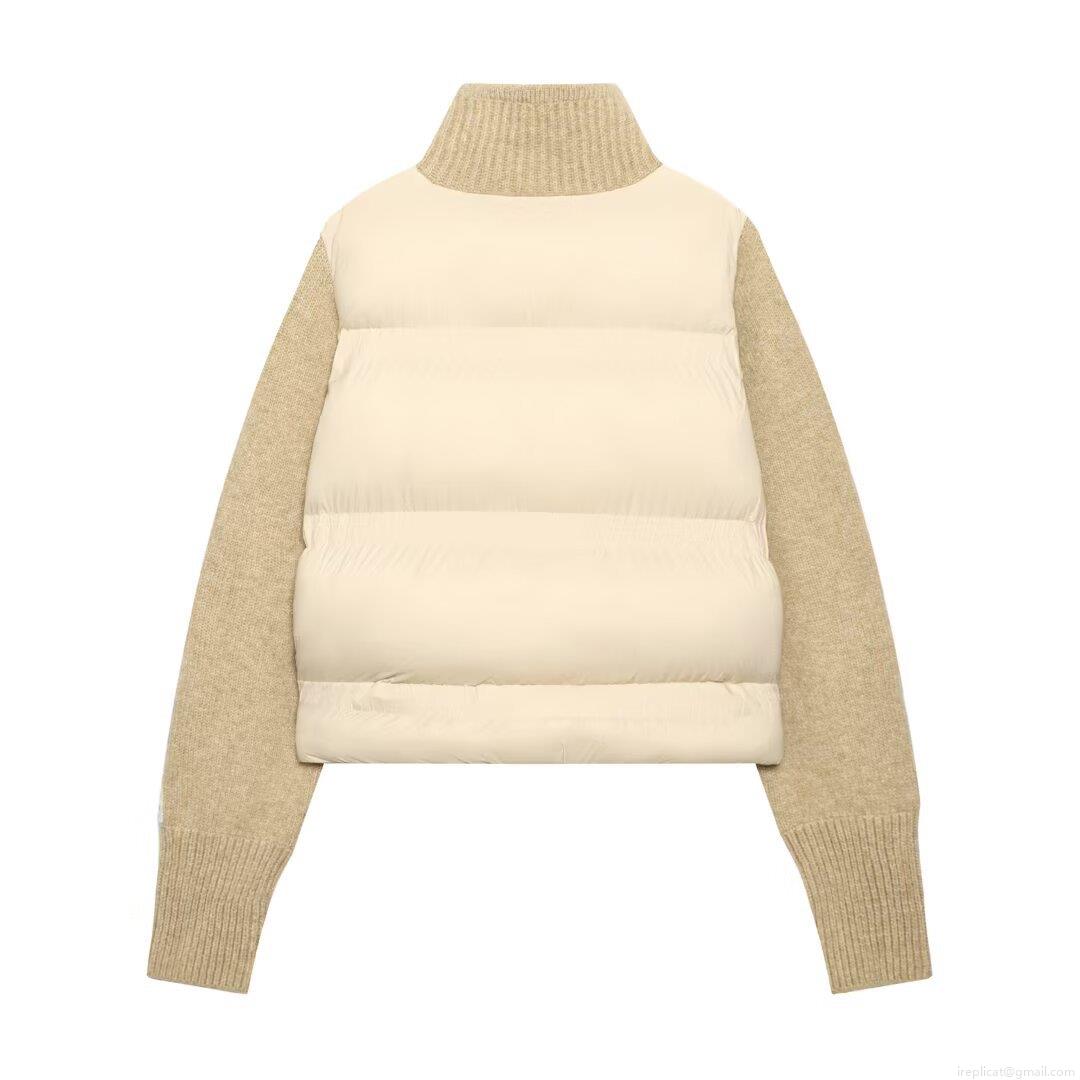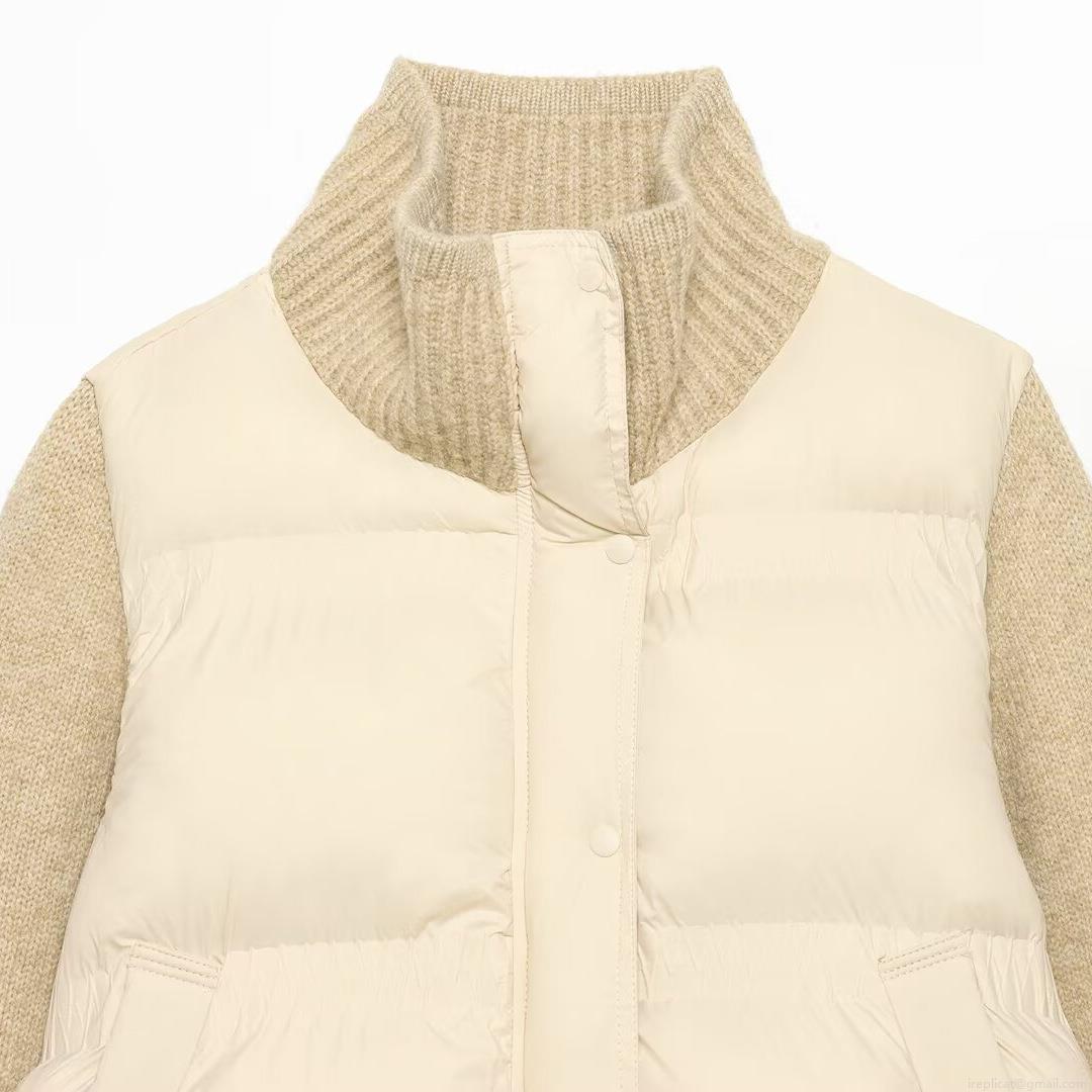 Women's Fashion Knitted Patchwork Padded Jacket Stand Collar Quilted Zip Up Winter Warm Coat Casual Oatmeal Grey Long Sleeve Outerwear