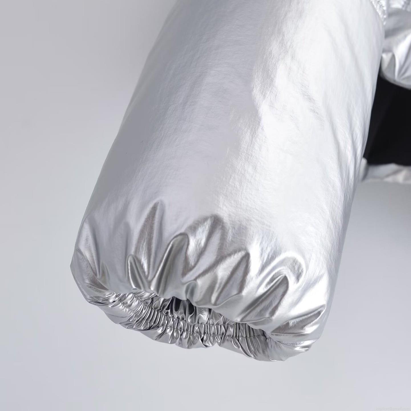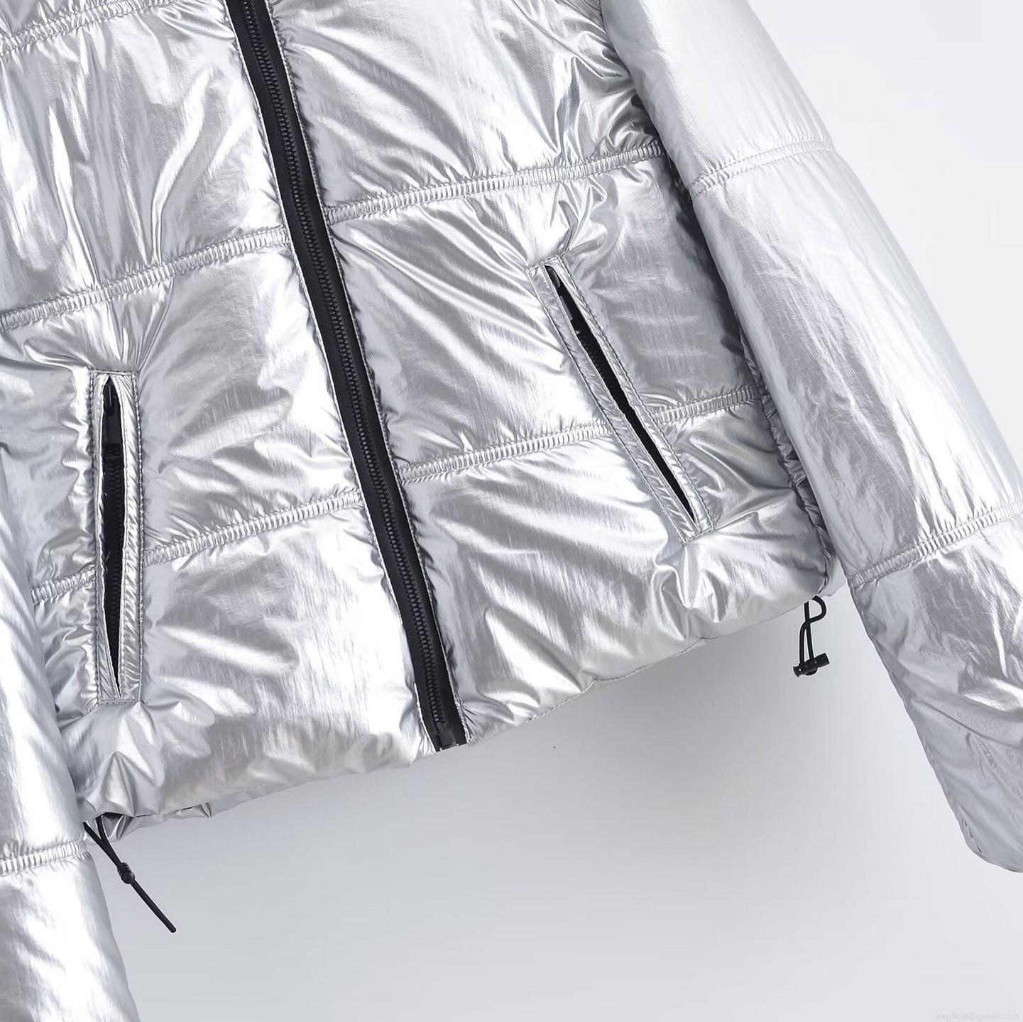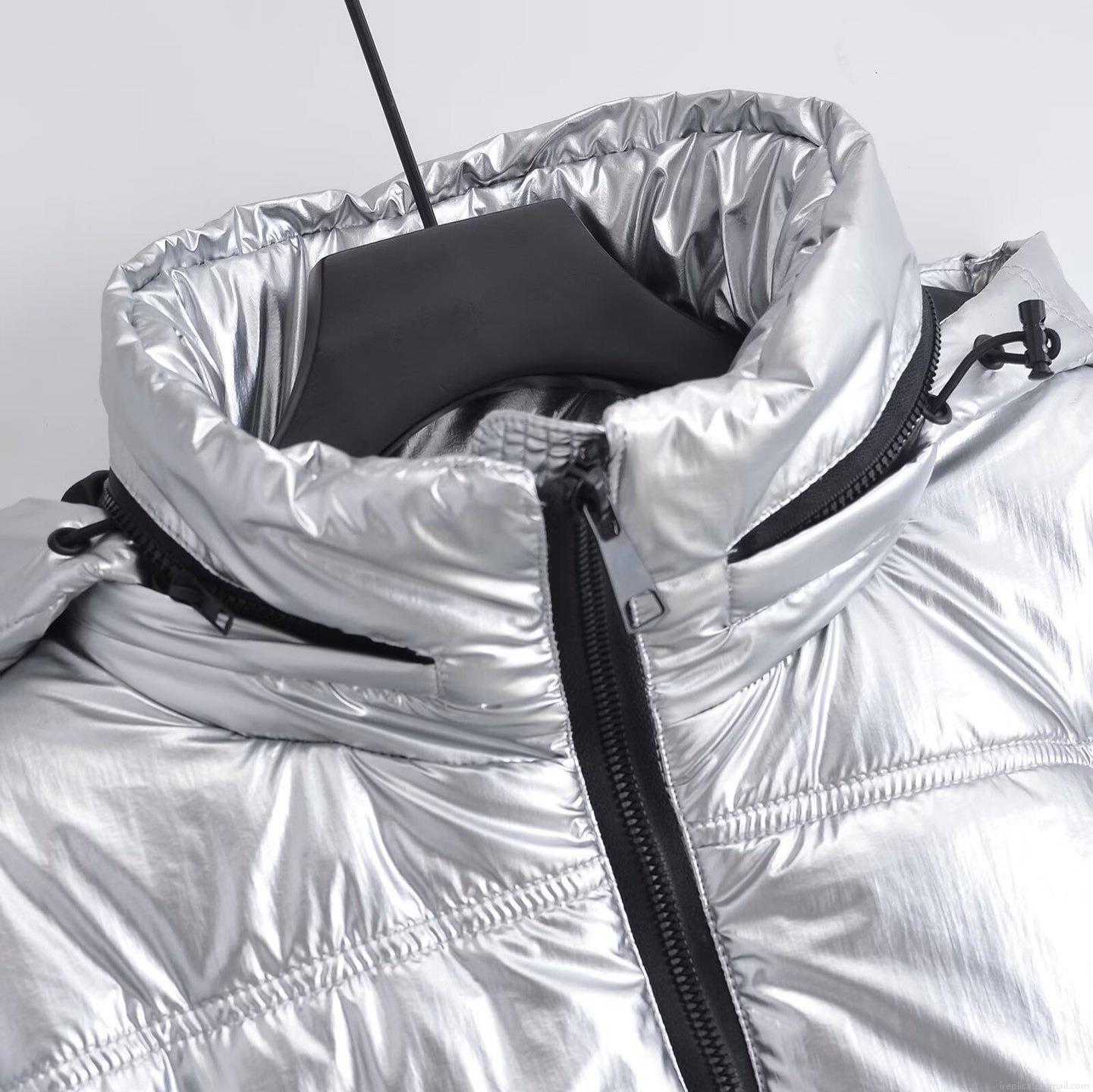 • Women's Fashion Metallic Glossy Hooded Puffer Jacket Thickened Warm Short Padded Coat With Zipper Pocket Casual Winter Outerwear