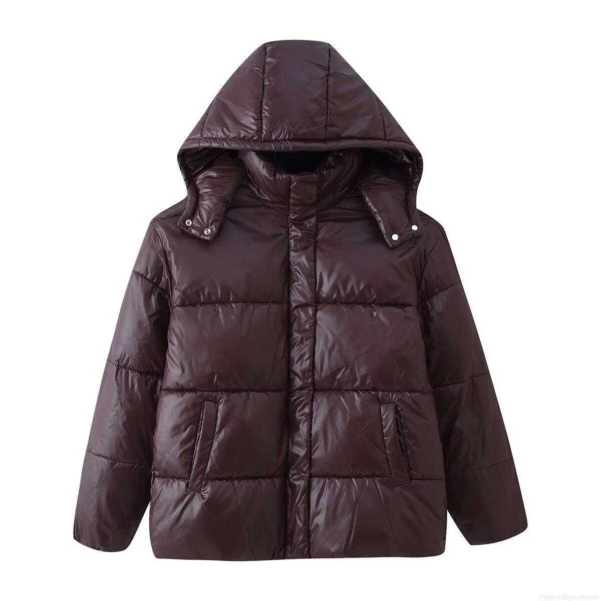 • Women's Fashion Shiny Hooded Puffer Jacket Short Quilted Padded Winter Coat Reddish Brown Casual Outdoor Streetwear Warm Outerwear