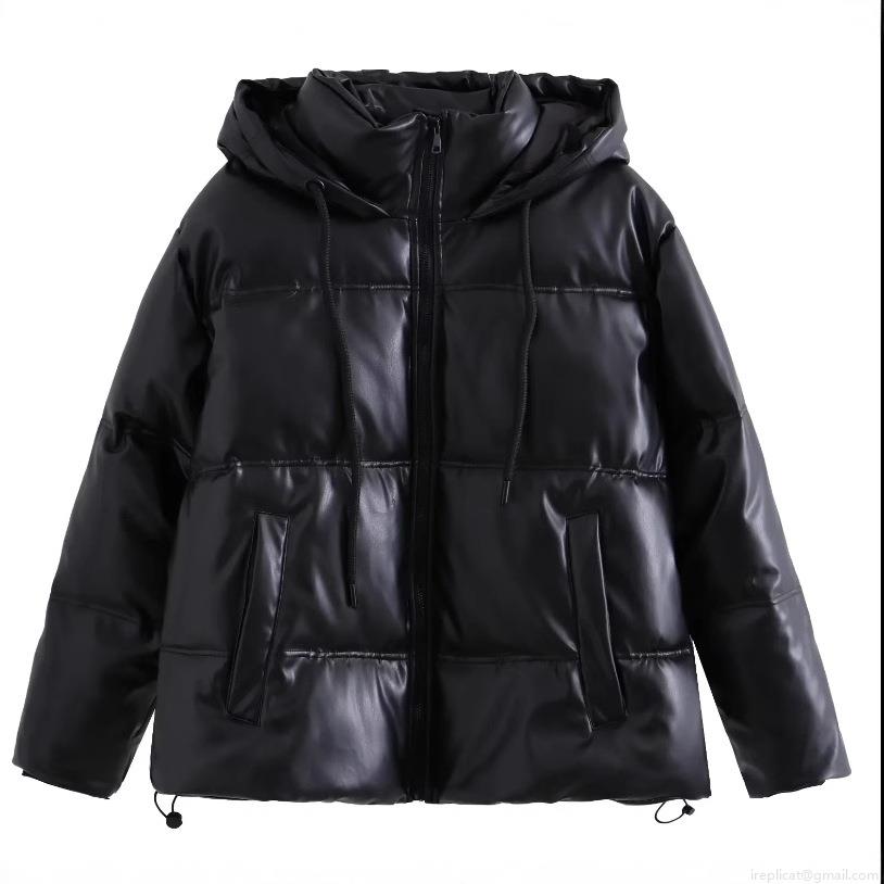 • Women's Faux Leather Puffer Jacket Hooded Quilted Winter Coat Warm Zip-Up Oversized Solid Color PU Leather Padded Outerwear For Women