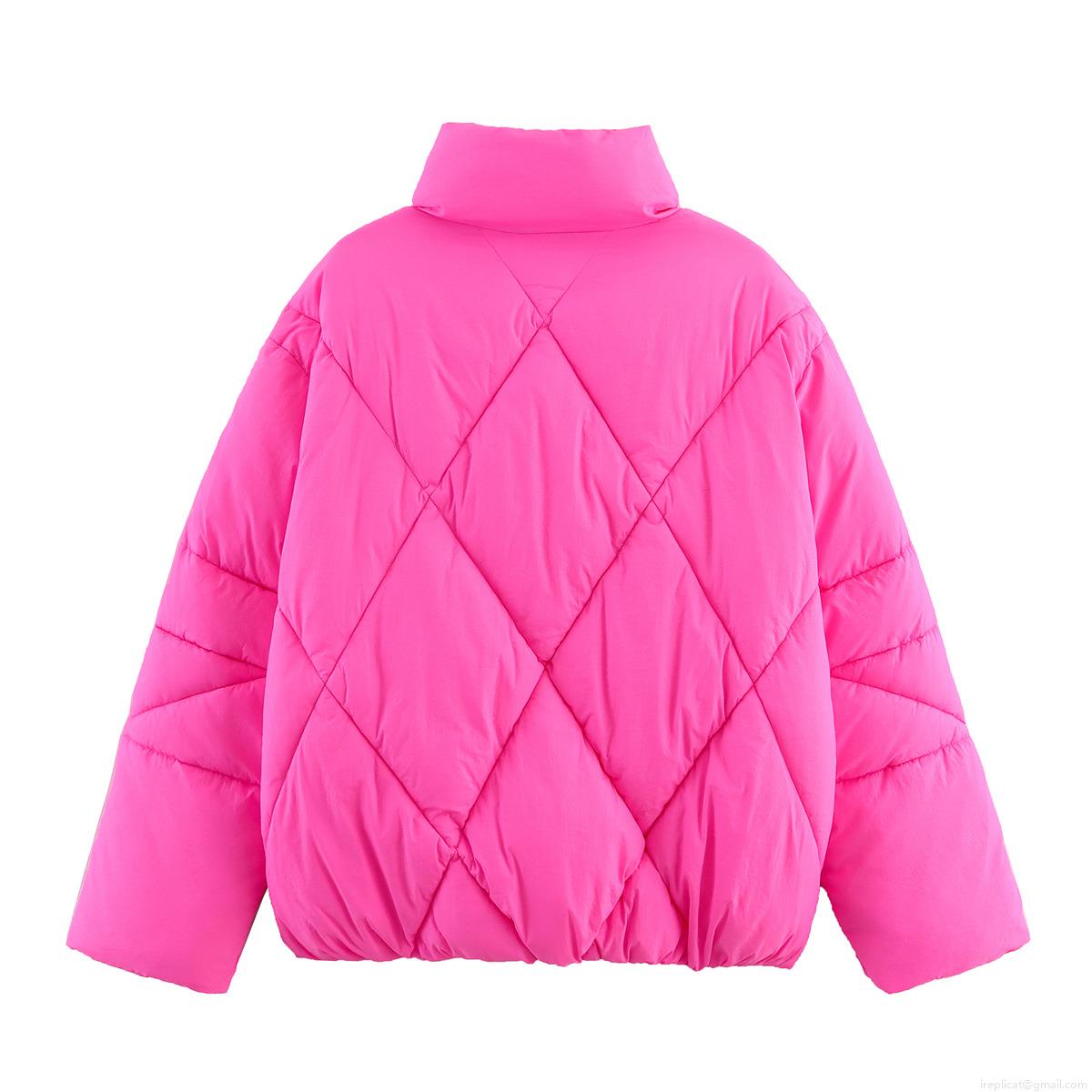 Women's Magenta Quilted Padded Jacket Casual Diamond Lattice Puffer Coat With Ribbon Bow Ties Stand Collar Winter Warm Outerwear For Women Retro Style
