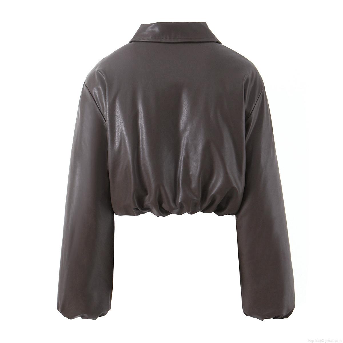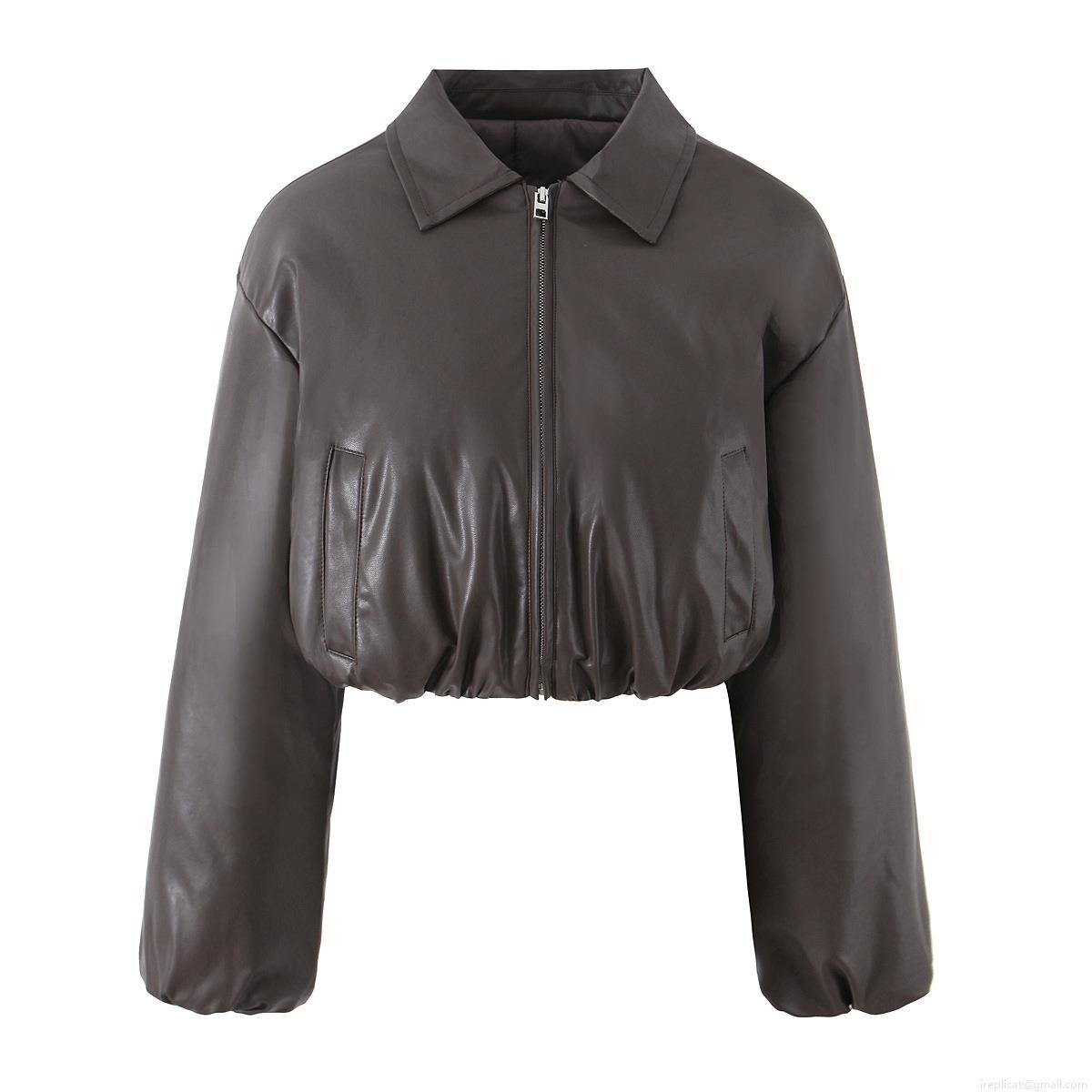 • Women's PU Leather Short Padded Jacket Western Street Style Lapel Long Sleeve Cropped Winter Coat With Zipper And Pockets For Female