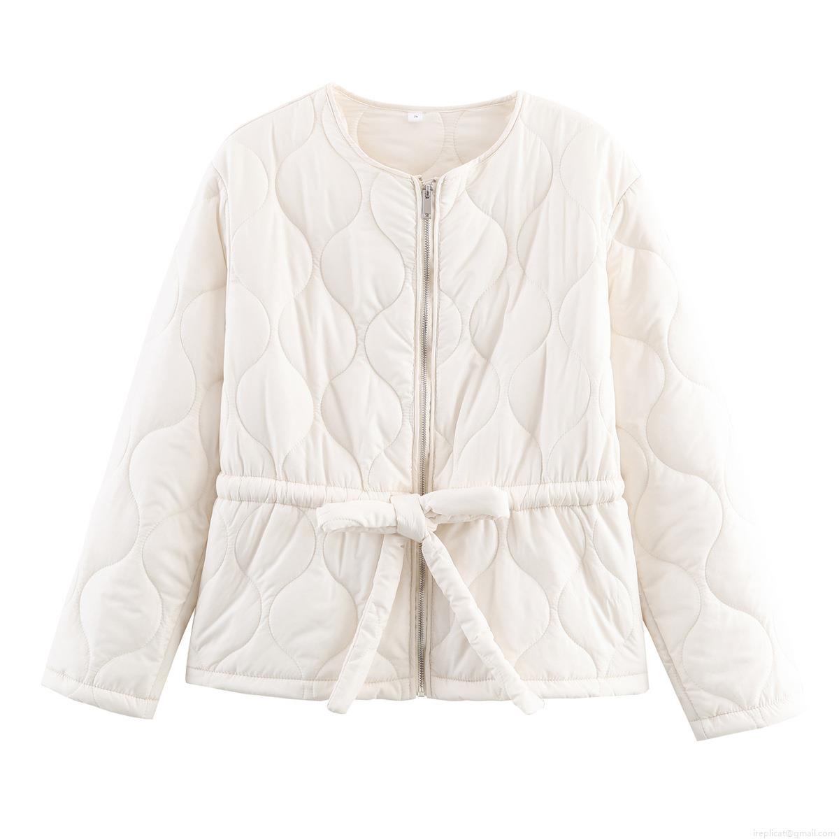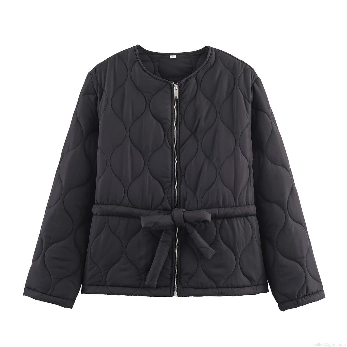 • Women's Quilted Puffer Jacket 100% Polyester Round Neck With Waist Belt Casual Long Sleeve Solid Color Warm Outerwear For Women