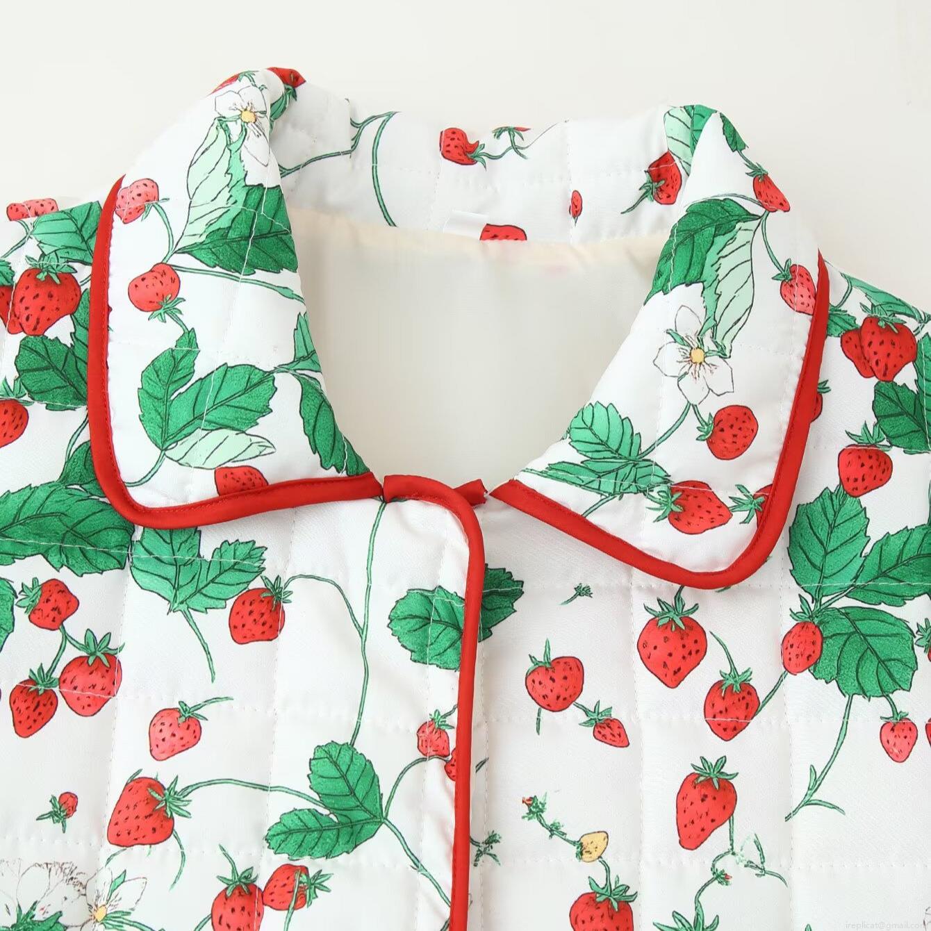 • Women's Quilted Strawberry Print Padded Jacket Polyester Outer Cotton Filling Casual Loose Button Down Outerwear Coat With Red Piping Pockets For Autumn Winter Ladies Fashion