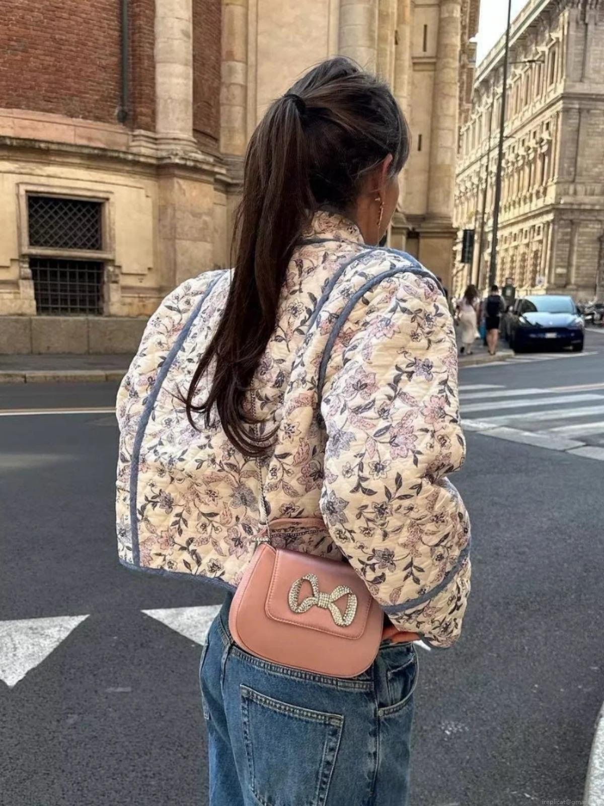 Women's Reversible Floral Print Quilted Jacket Stand Collar Cropped Padded Coat With Contrast Trim Vintage Streetwear Autumn Outwear