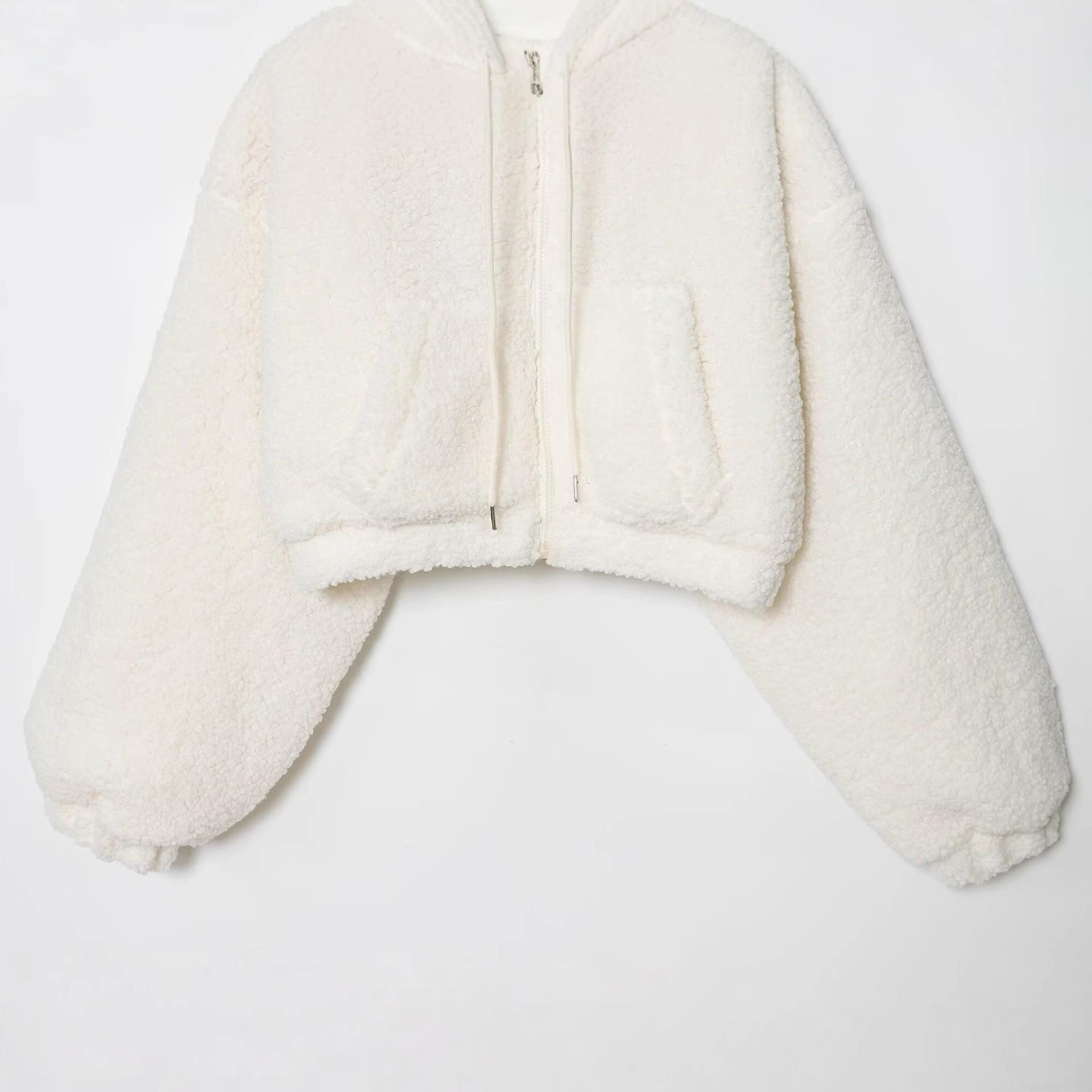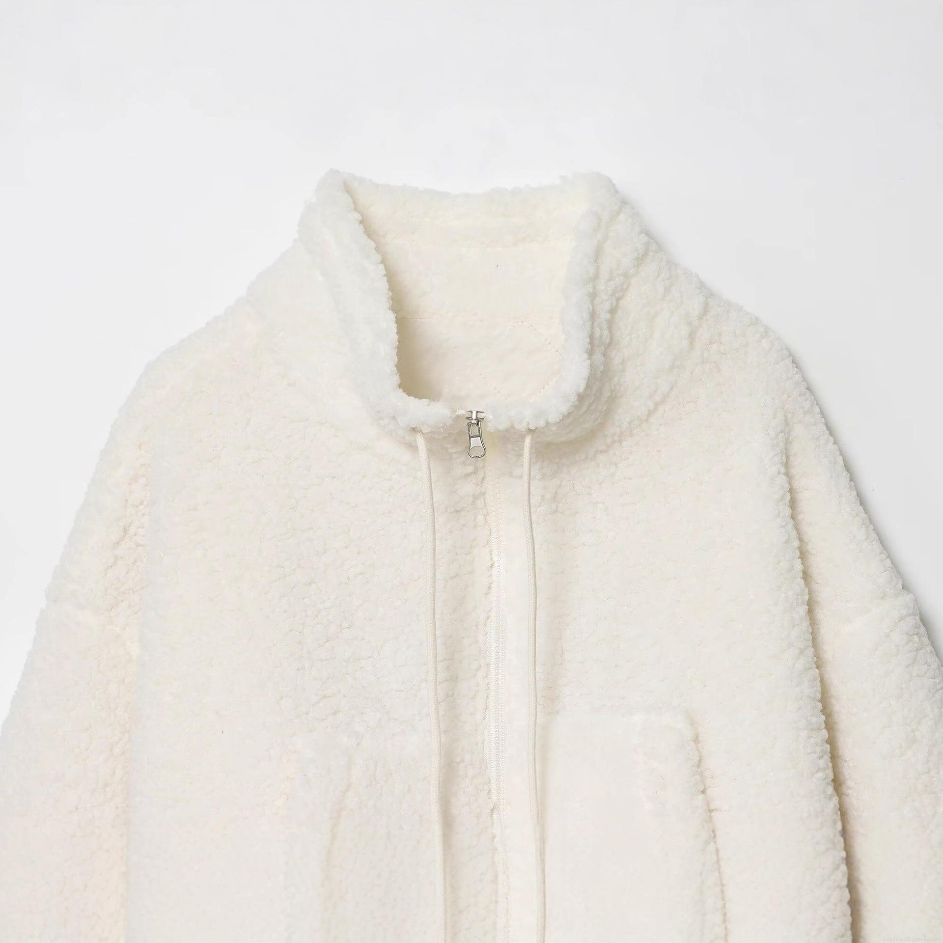 • Women's Short Faux Lamb Wool Fleece Jacket Stand Collar Zipper Padded Outwear With Drawstring Casual Solid Color Warm Coat For Autumn Winter