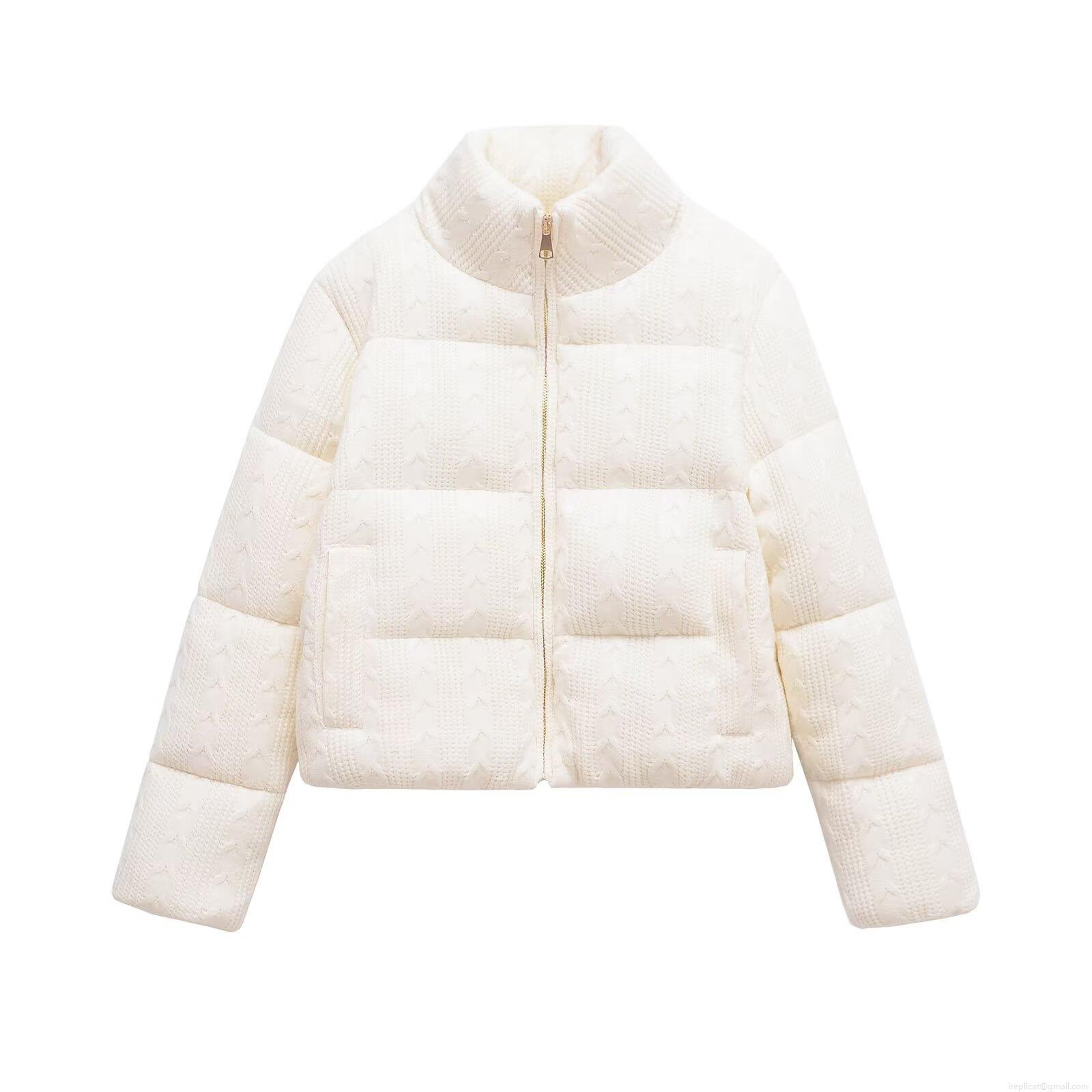 Women's Short Puffer Jacket Knit Texture Stand Collar Zipper Casual Warm Cotton Padded Coat Solid Color Polyester Outwear For Winter Spring Streetwear