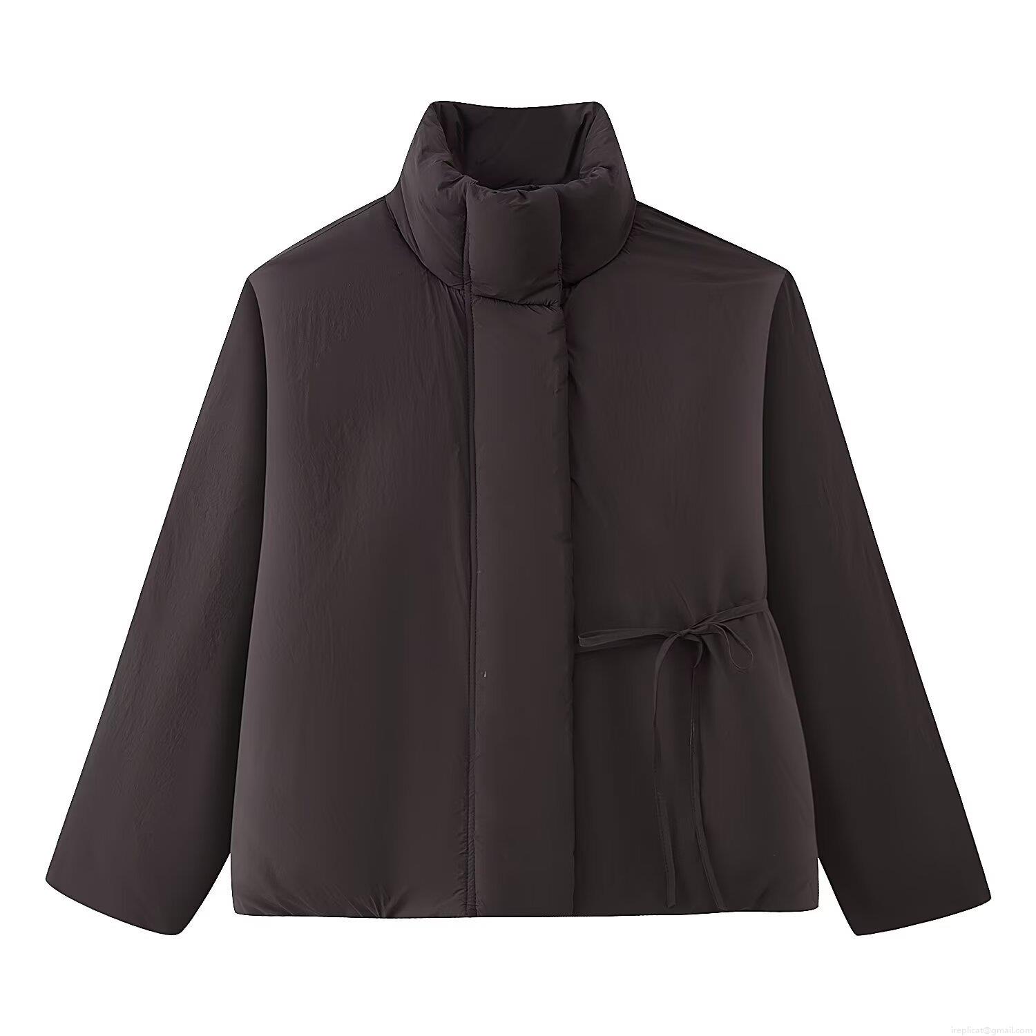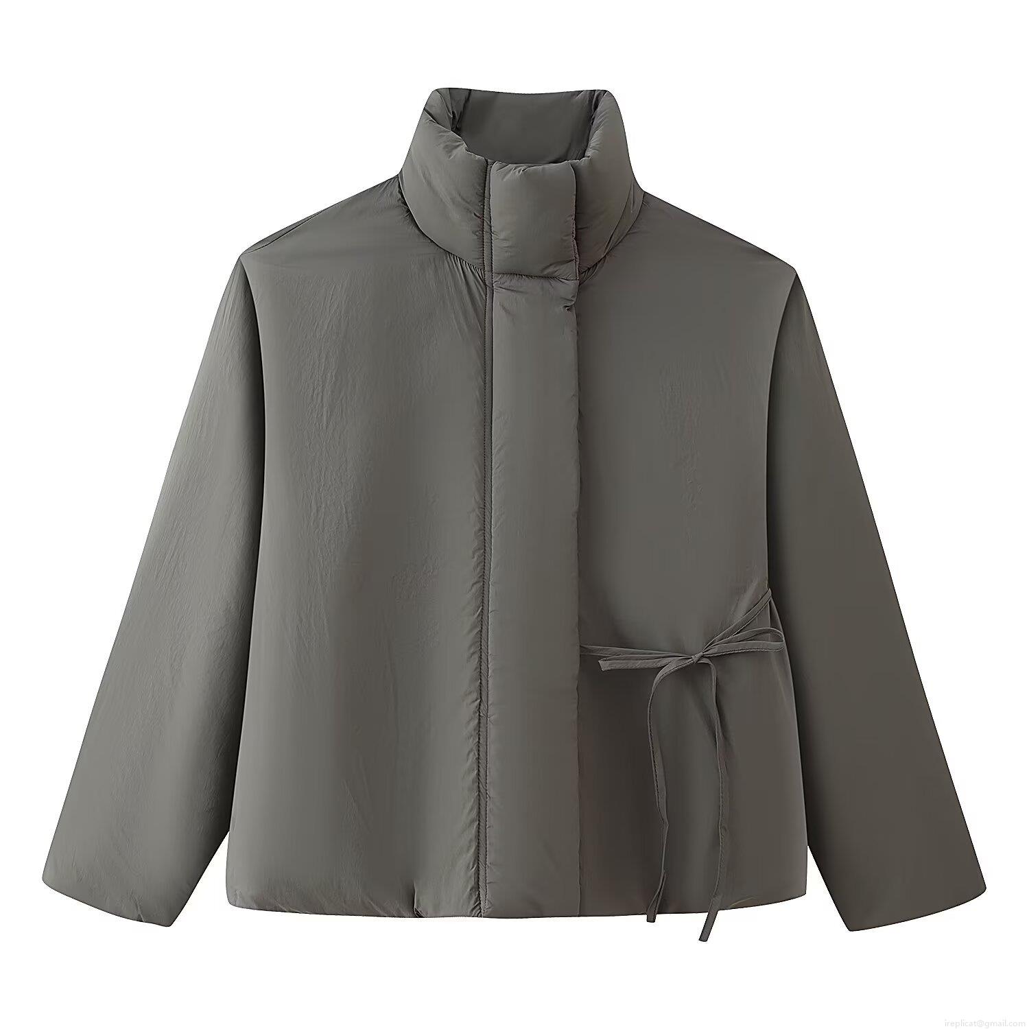 • Women's Short Puffer Jacket Stand Collar Long Sleeve Tie Waist Cotton Padded Coat Casual Loose Solid Color Warm Polyester Outerwear For Autumn Winter Ladies