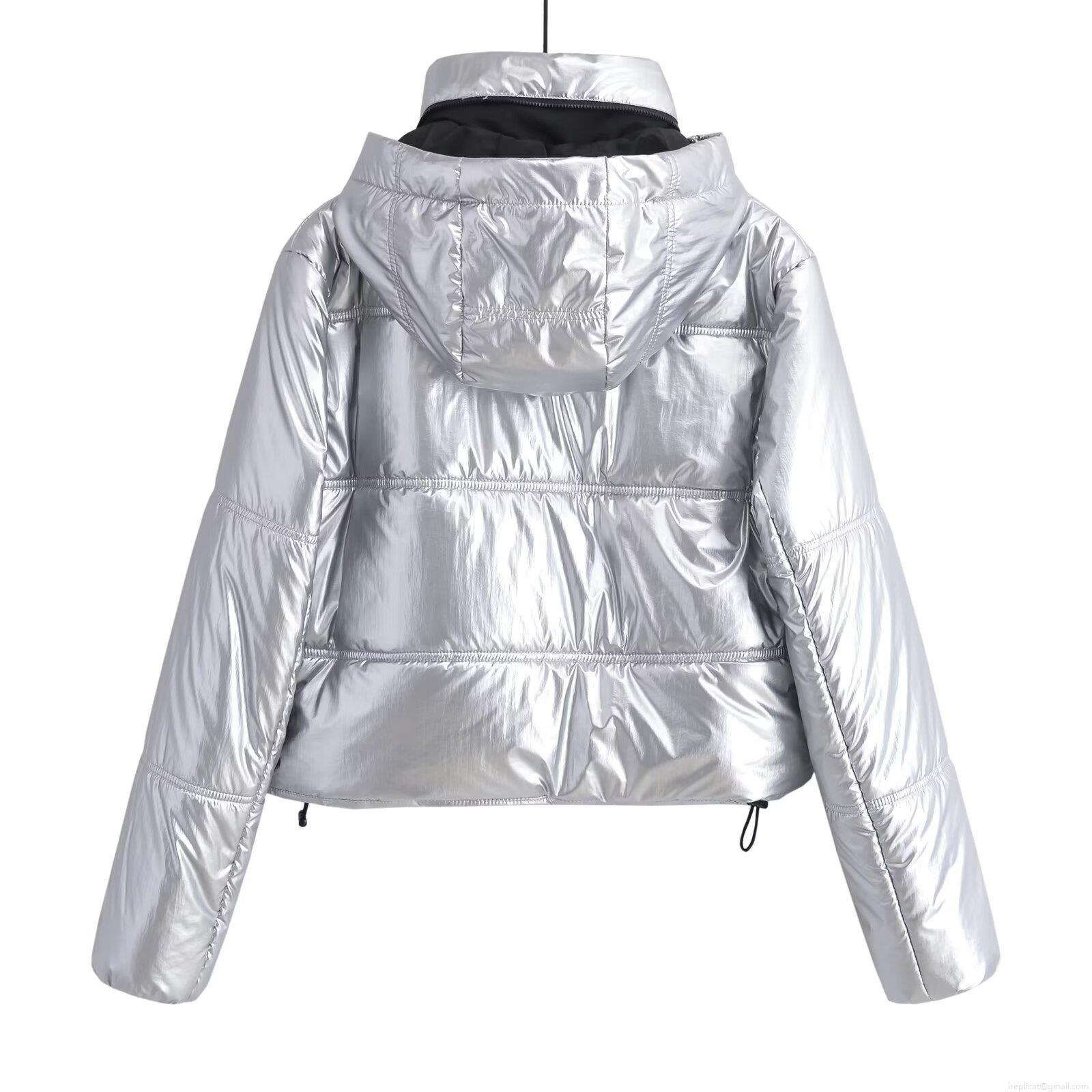 Women's Silver Metallic Hooded Puffer Jacket Shiny Padded Coat Short Winter Warm Outerwear Windproof Zip Up Quilted Jacket Women Streetwear Fashion