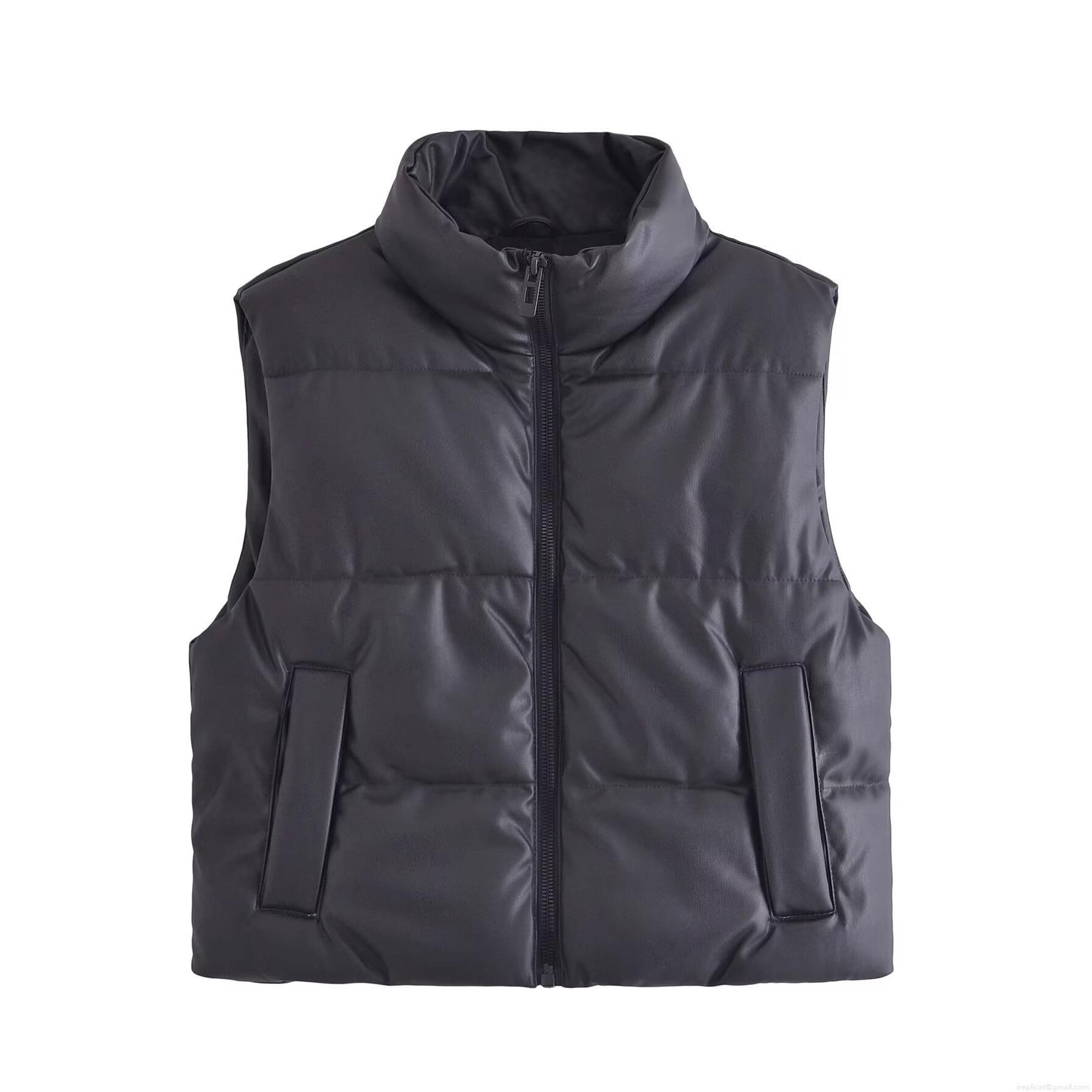 • Women's Stand Collar PU Leather Quilted Vest Puffer Waistcoat Sleeveless Jacket Outerwear Autumn Winter Warm Streetwear Casual Zip Up Solid Color Short Gilet