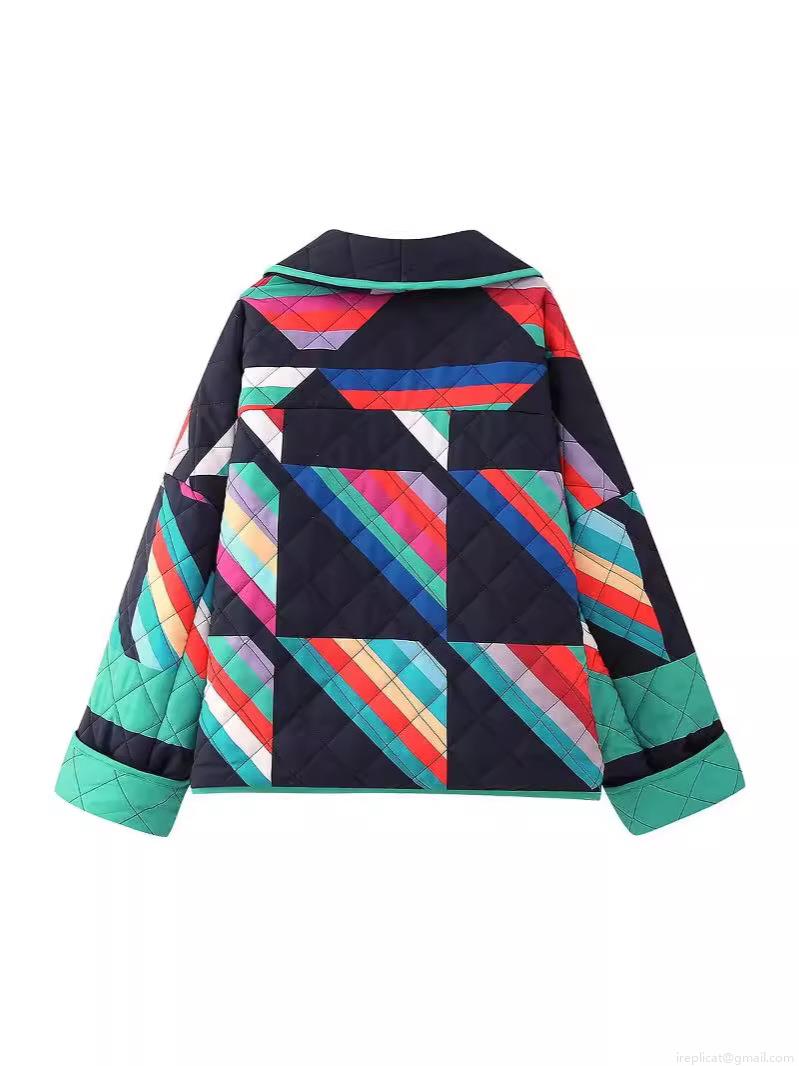 • Women's Streetwear Quilted Padded Jacket Geometric Print Color Block Open Front V-Neck Loose Outerwear Autumn Winter Casual Polyester Coat