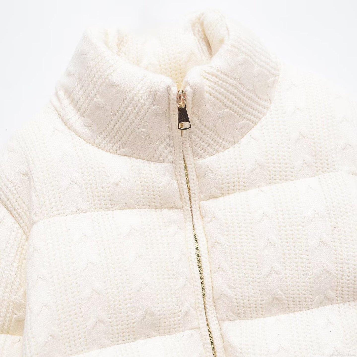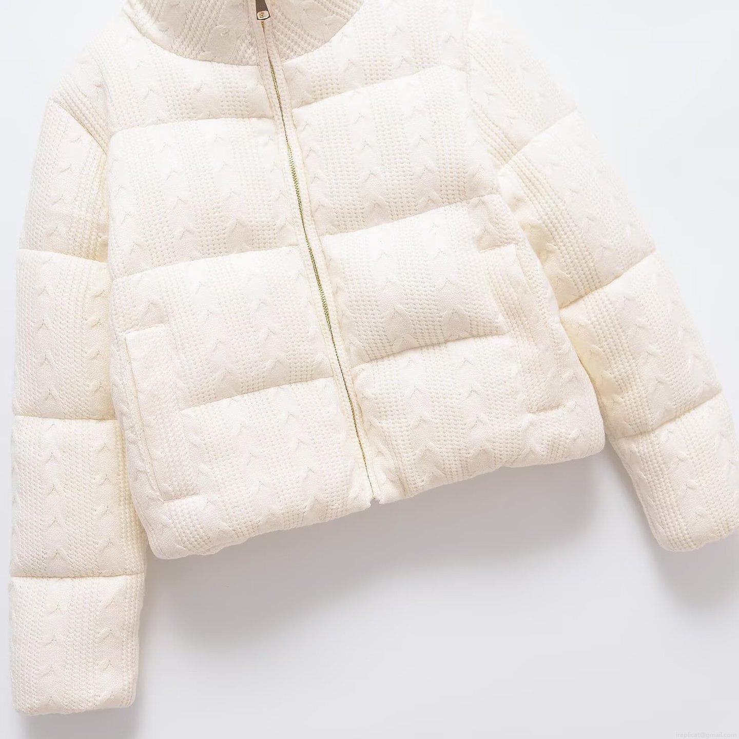 • Women's Thickened Cable Knit Puffer Jacket Fashion Stand Collar Warm Winter Short Cotton Padded Coat With Metal Zipper For Women