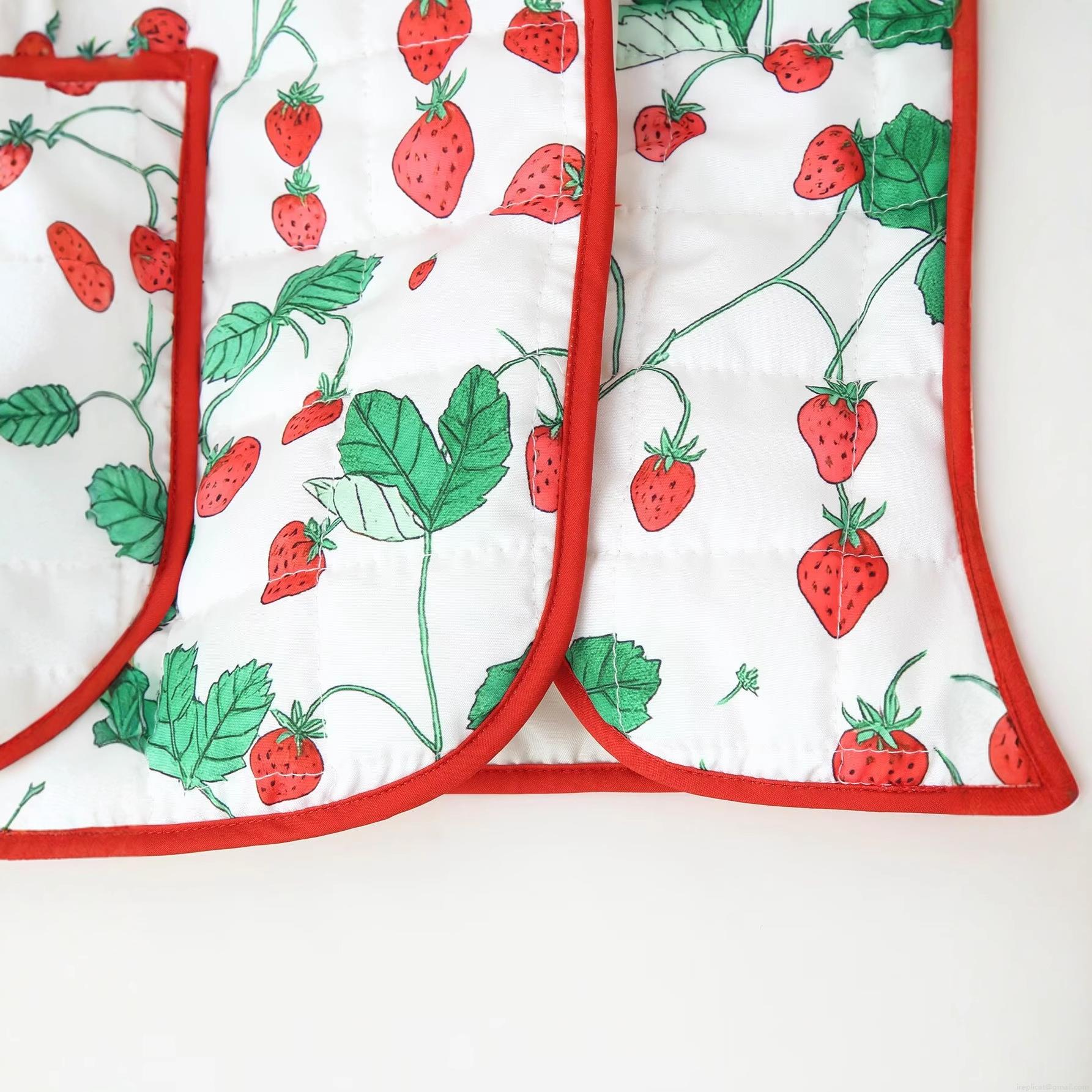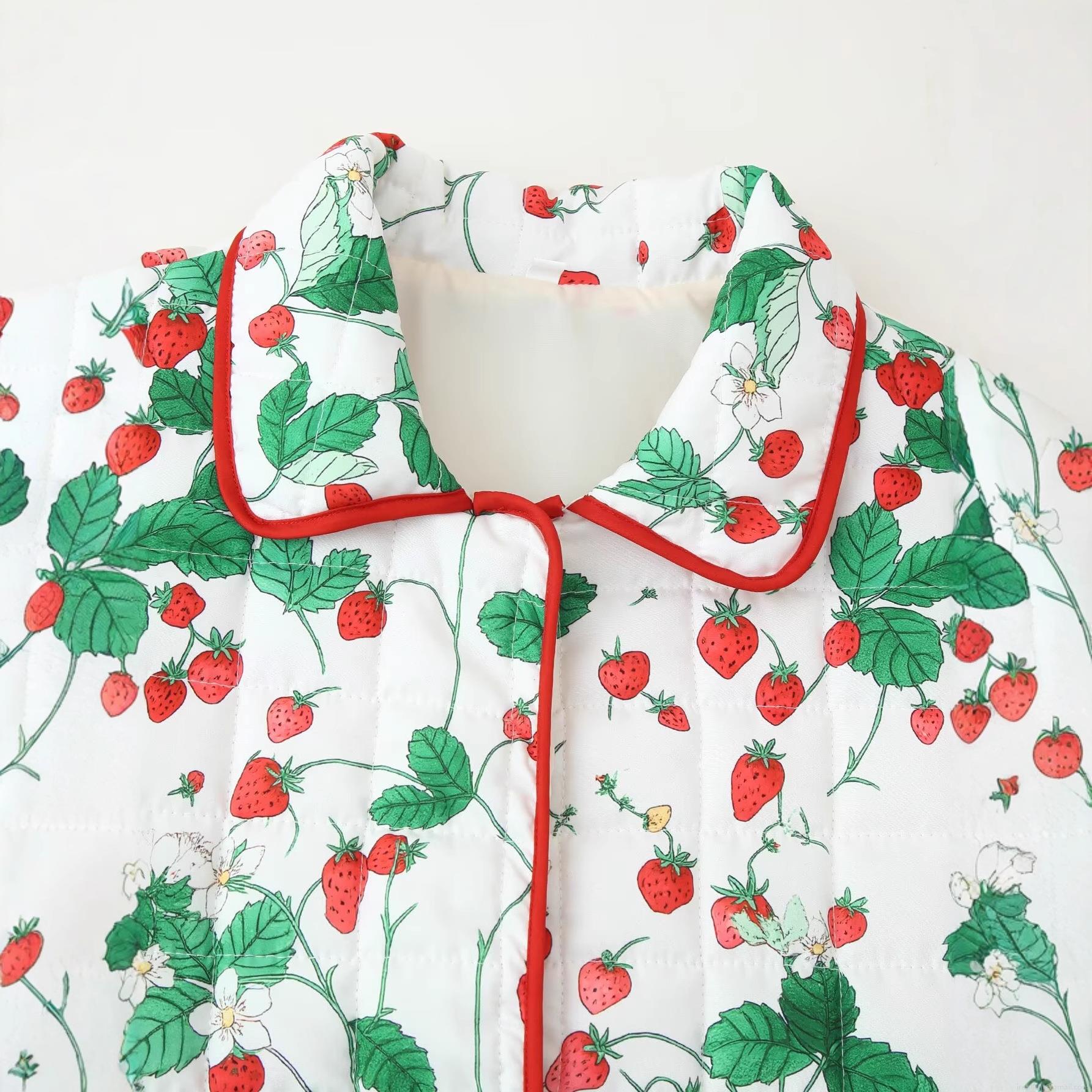 Women's Vintage Quilted Cotton Jacket Strawberry Print Warm Outerwear Long Sleeve Button Down Coat With Pockets For Autumn Winter