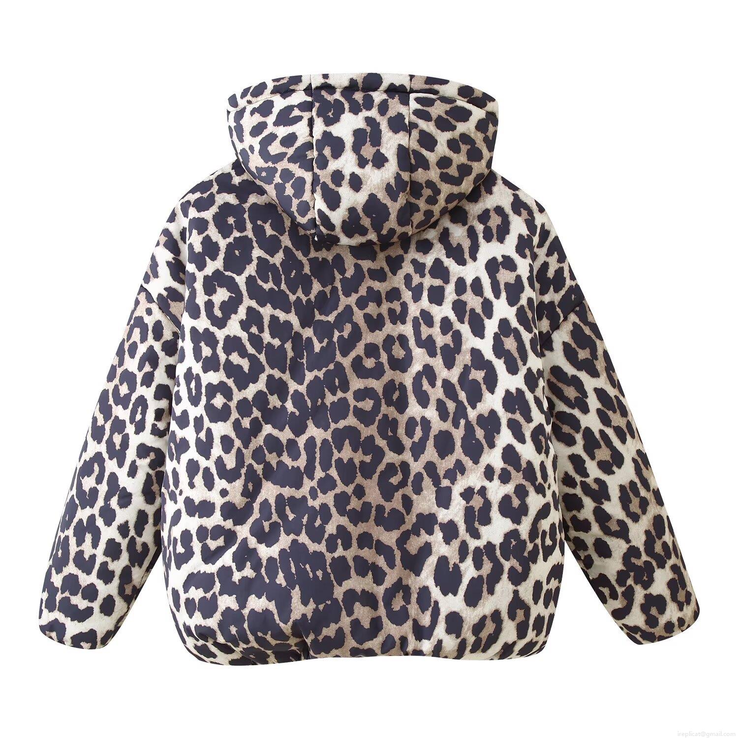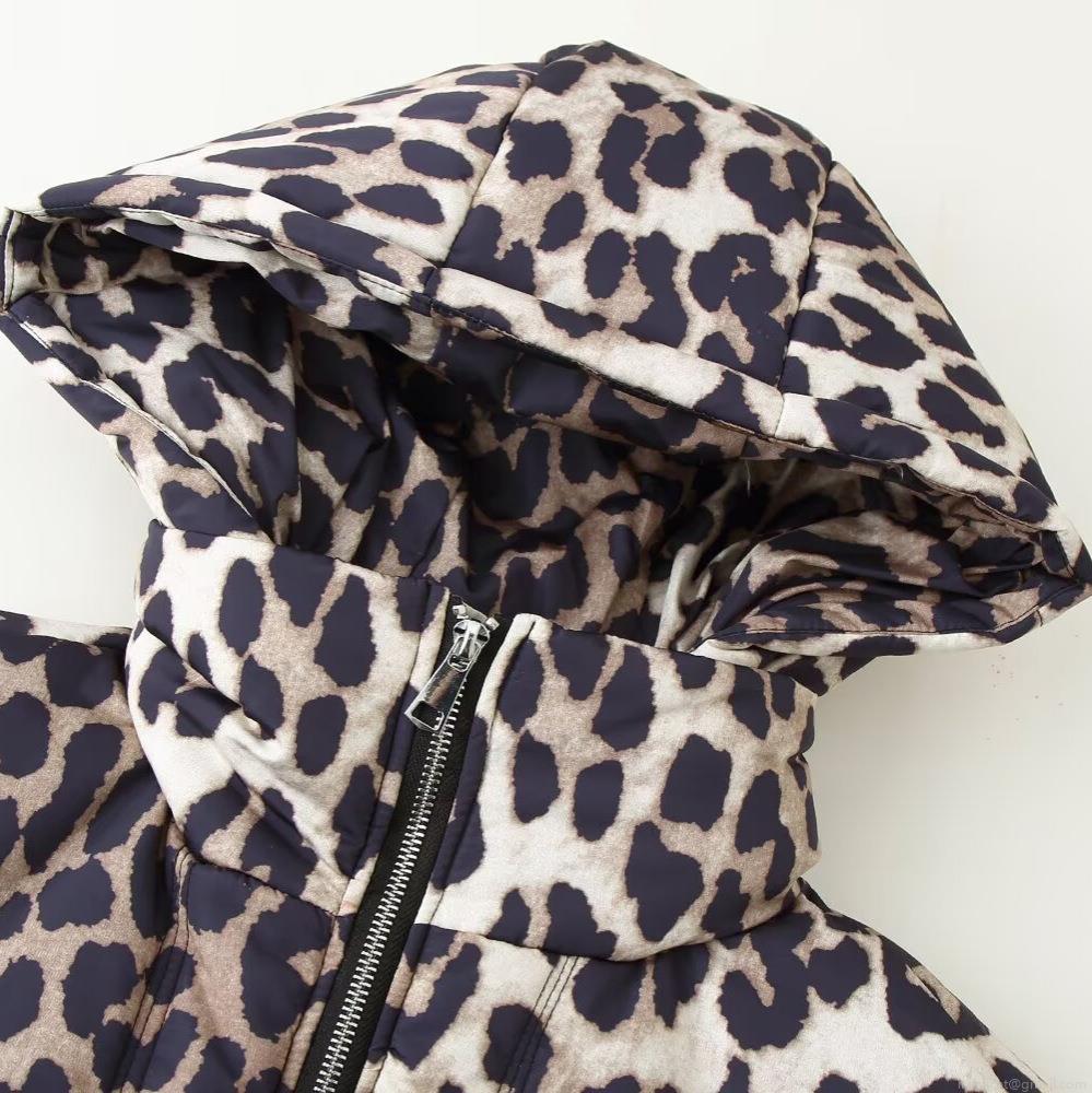 • Women's Winter Leopard Print Hooded Puffer Jacket Casual Thick Warm Polyester Padded Coat With Zipper Pockets Outerwear For Daily Wear