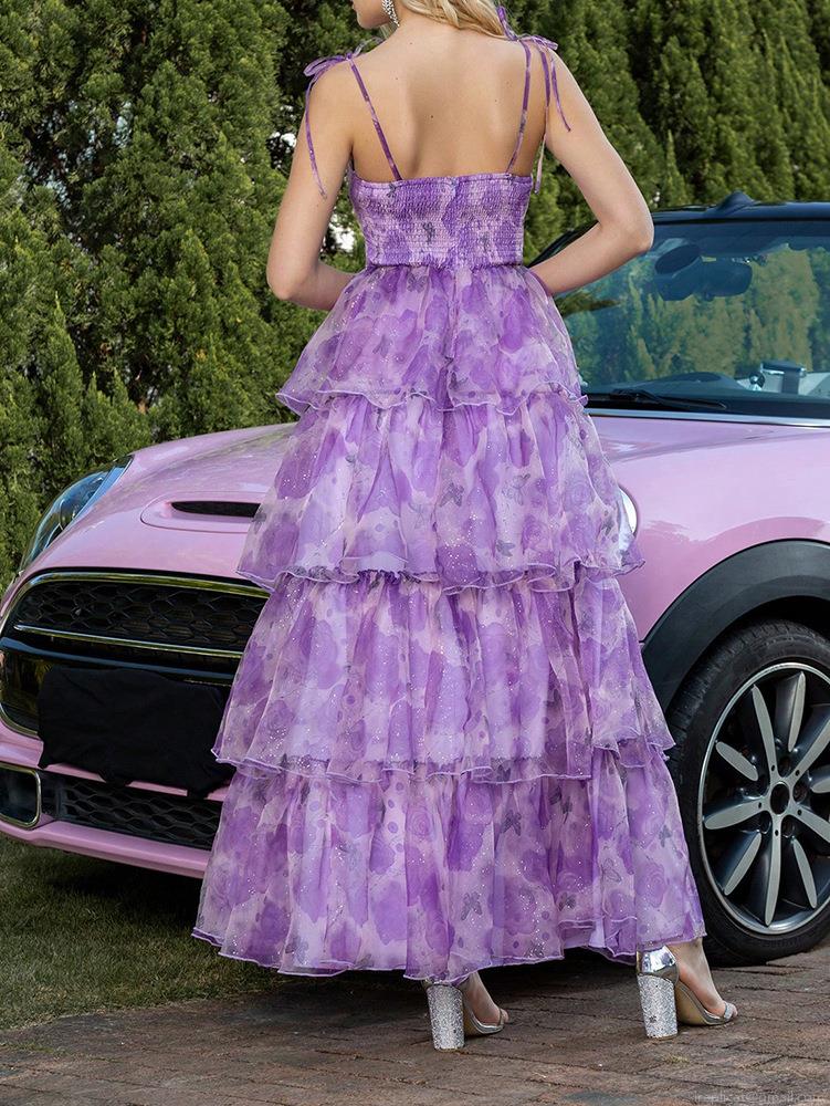 • Women's Purple Floral Butterfly Print Mesh Layered Cake Dress Hollow Out Waist High-Low Ruffle Maxi Dress Sleeveless Romantic Princess Style Party Vacation Gown Polyester Spandex