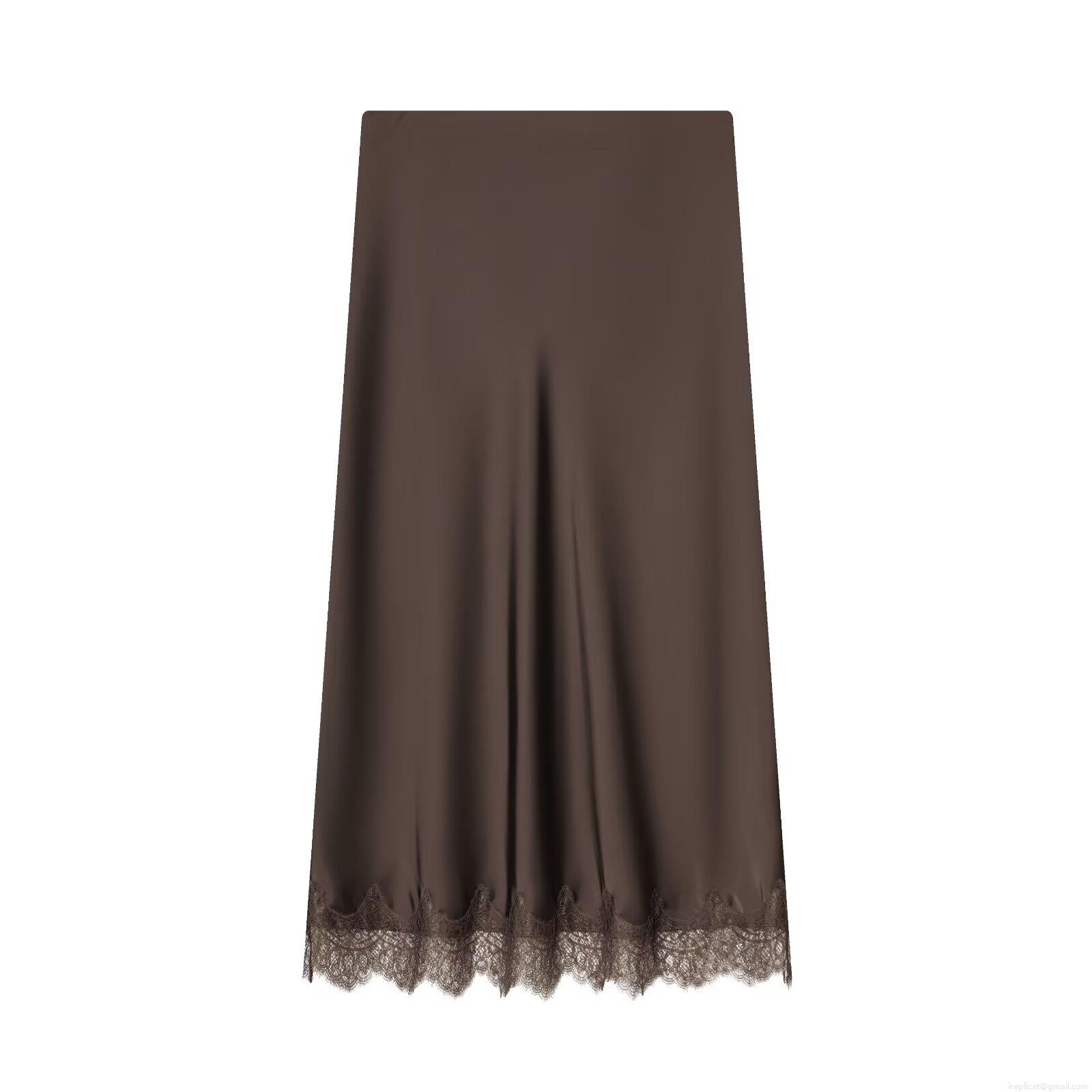 Solid Color, Lace Trim, Splicing Design, Silk Satin Texture, Midi Skirt