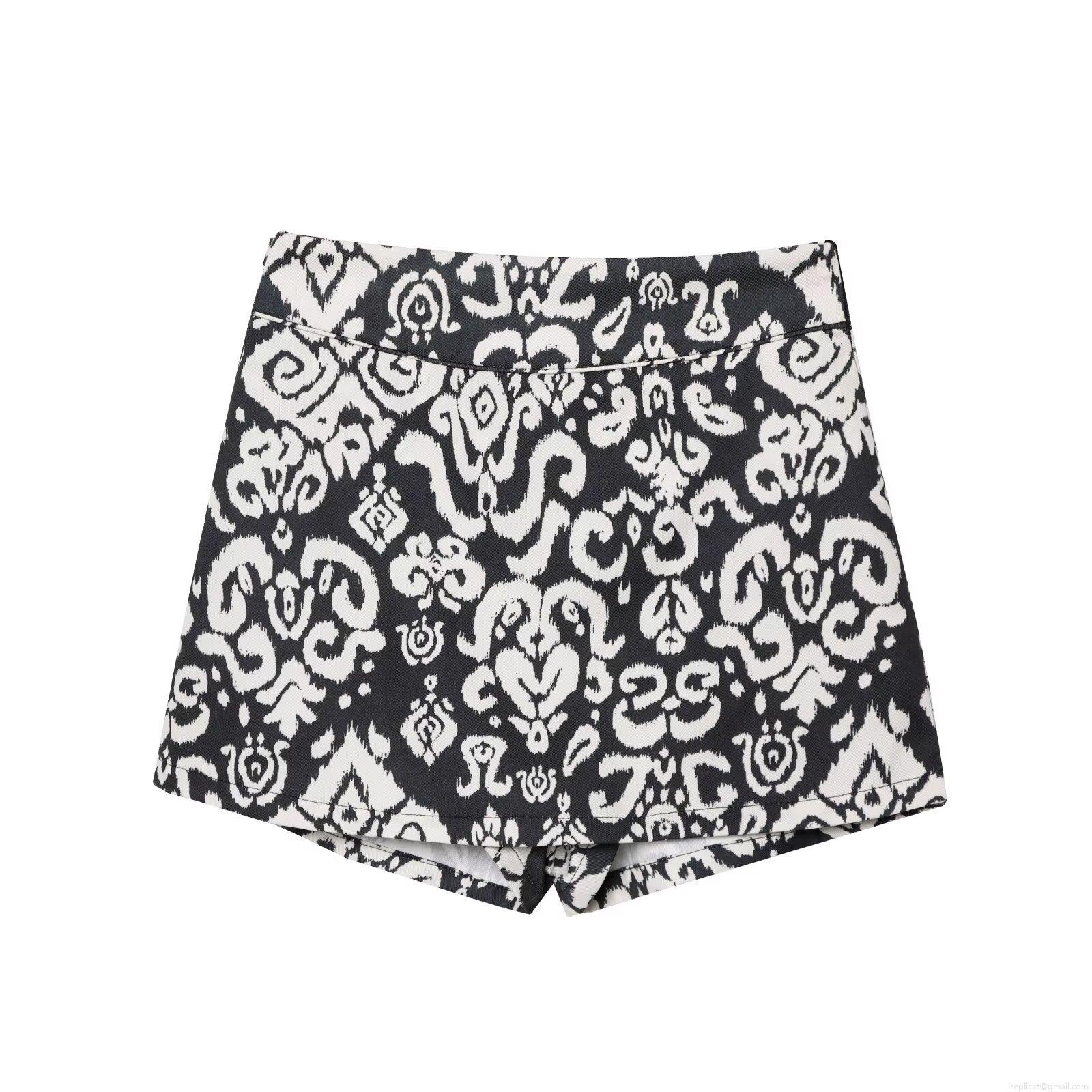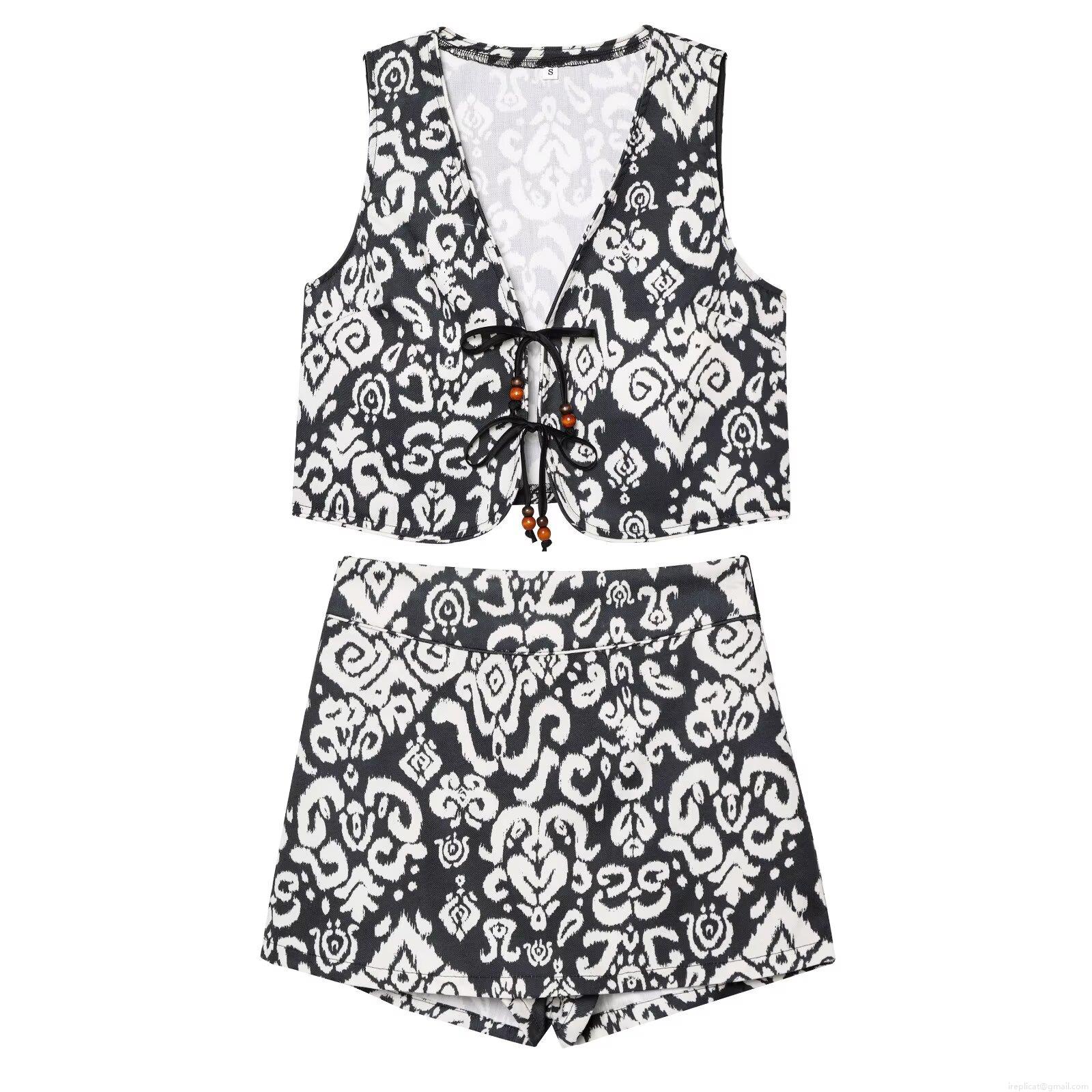 • Bohemian Black And White Print Two Piece Set For Women Sleeveless V Neck Tie Front Vest And High Waist Shorts Ethnic Summer Beach Casual Outfits