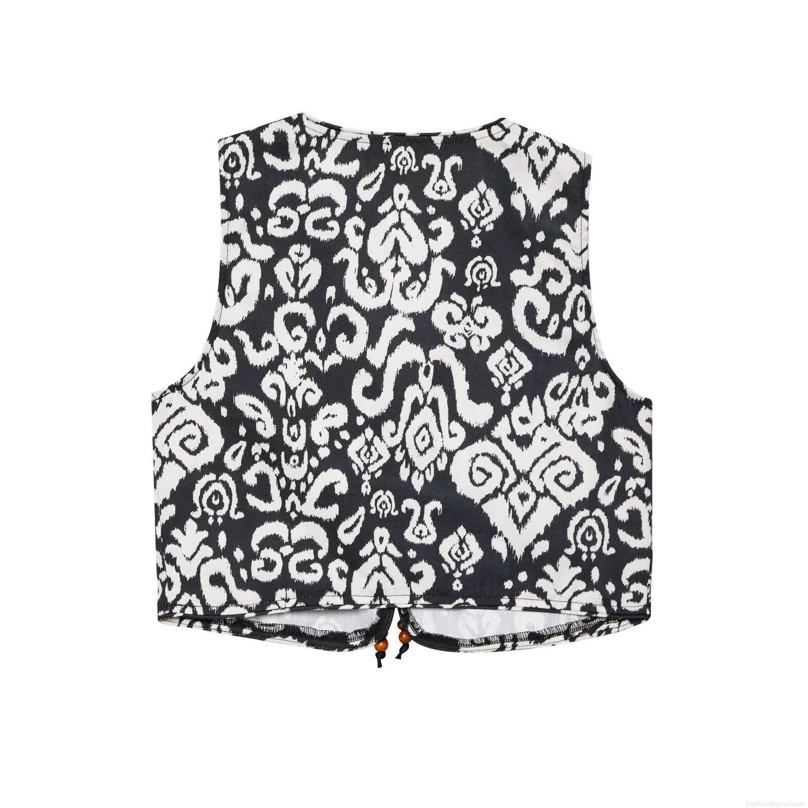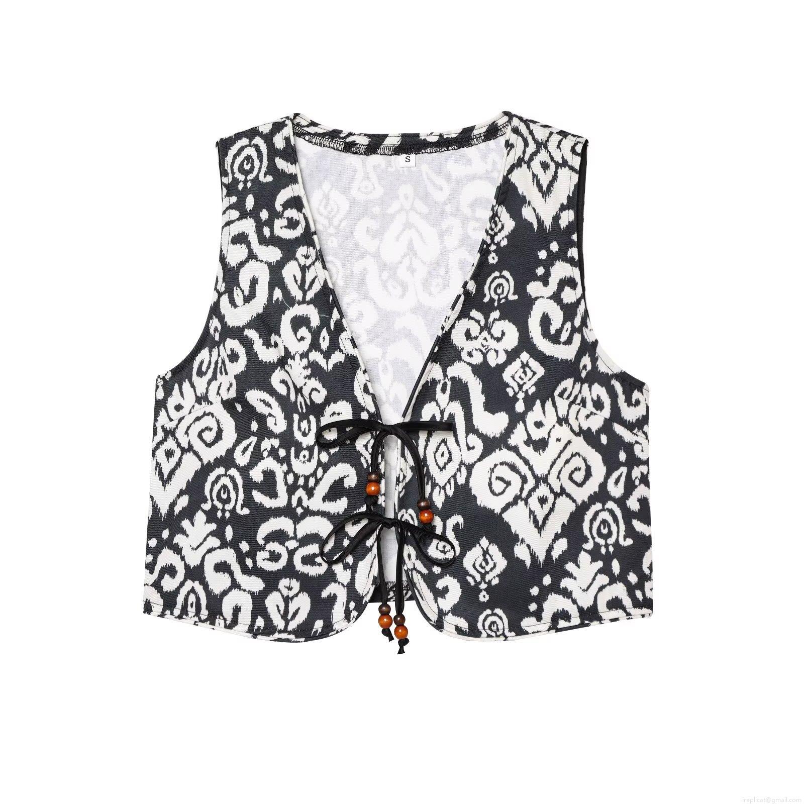 Bohemian Black And White Print Two Piece Set For Women Sleeveless V Neck Tie Front Vest And High Waist Shorts Ethnic Summer Beach Casual Outfits
