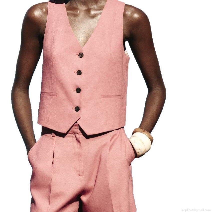 • British Style Women's Sleeveless V-Neck Button Vest And High Waist Shorts Linen Blend Solid Color Casual Commuting Two-Piece Set