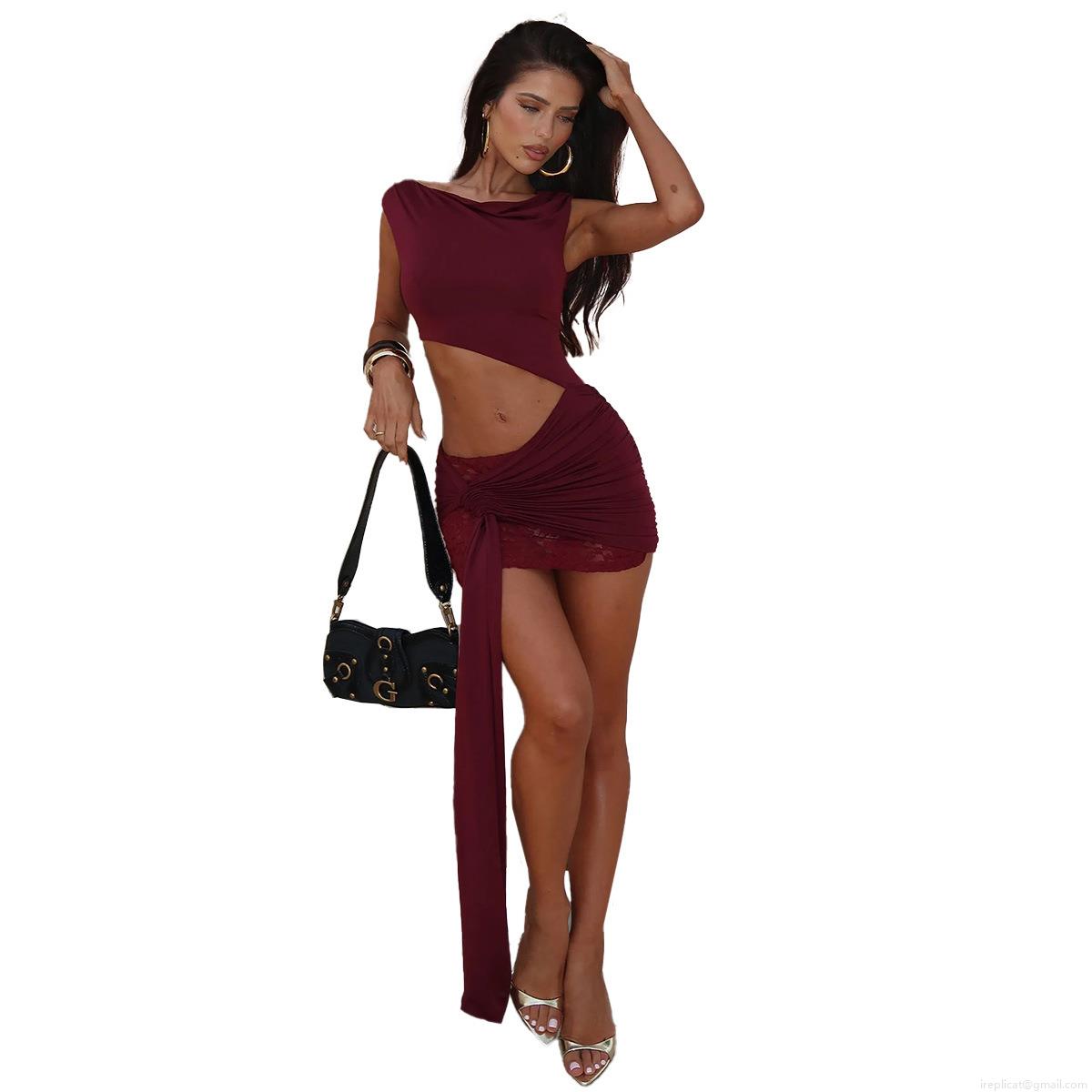 • Sexy Burgundy 3-Piece Skirt Set Hollow Out One Shoulder Crop Top With Lace Patchwork Mini Skirt Long Streamer Party Clubwear For Women