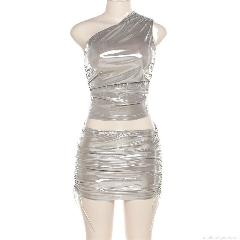 Sexy Two Piece Outfits For Women Metallic One Shoulder Crop Top And Ruched Mini Skirt Set Clubwear Party Night Out Clothing Bodycon Summer Skirt Sets