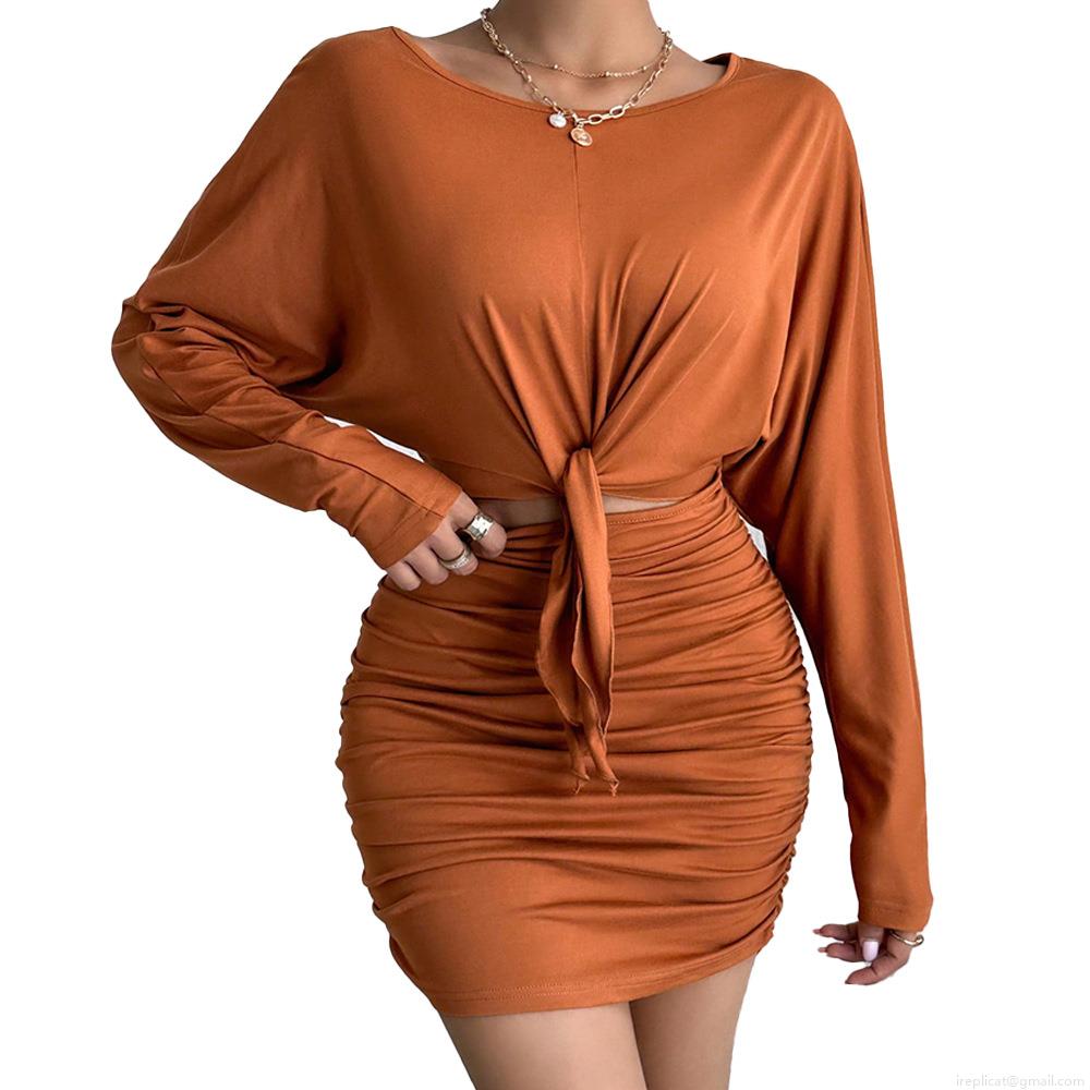 • Sexy Women's Two-Piece Skirt Set Long Sleeve Tie Front Crop Top And Ruched Bodycon Mini Skirt Solid Caramel Knit Outfits For Party Clubwear