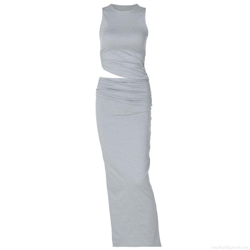• Women 2 Piece Maxi Skirt Set Sleeveless Round Neck Crop Top And Ruched Side Slit Long Skirt Set Polyester Spandex Knit Bodycon Summer Streetwear Club Outfits Sexy Fashion Lady