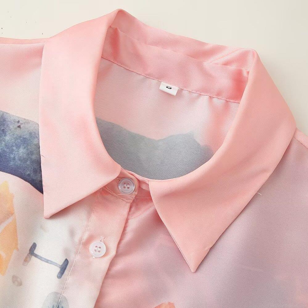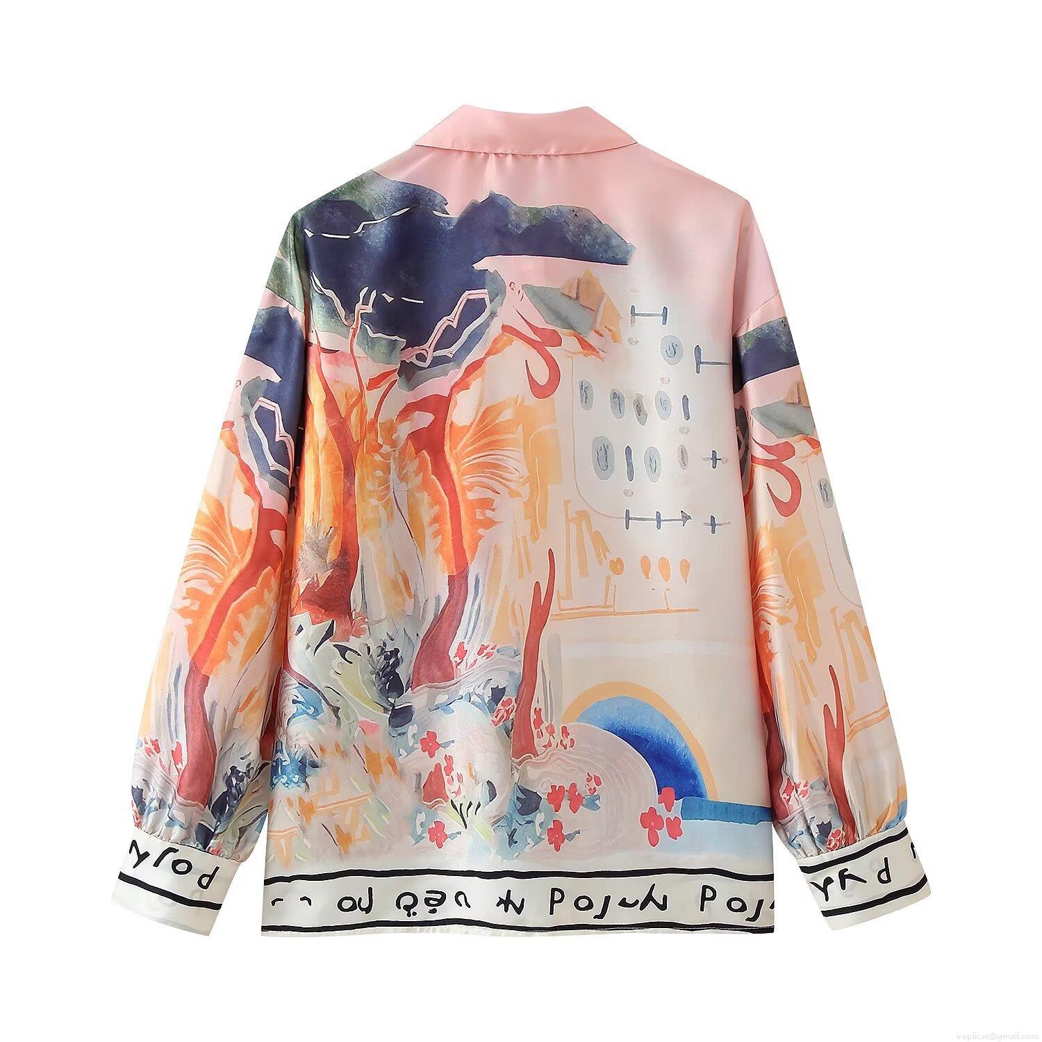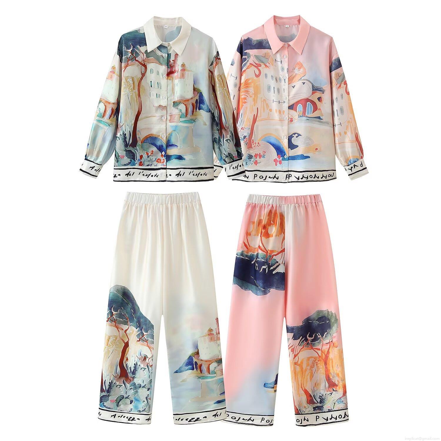 • Women Artistic Landscape Print Satin Shirt And Wide Leg Pants Set Elegant Long Sleeve Lapel Blouse High Waist Trousers Two Piece Outfits For Vacation Casual Wear