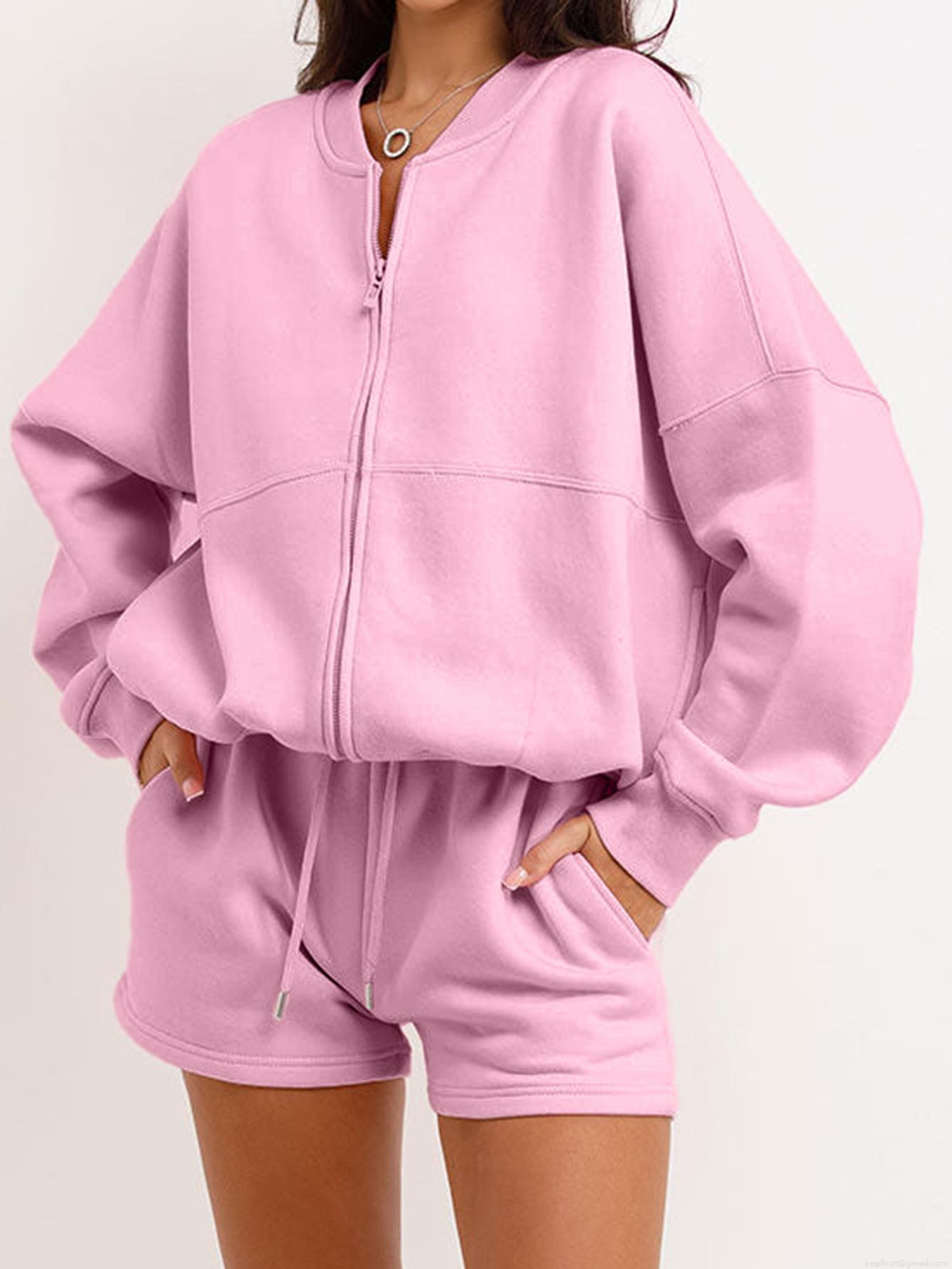 • Women Casual Two Piece Tracksuit Set 100 Percent Polyester Long Sleeve Zipper Stand Collar Jacket And Drawstring Shorts Lounge Outfit For Women Pink