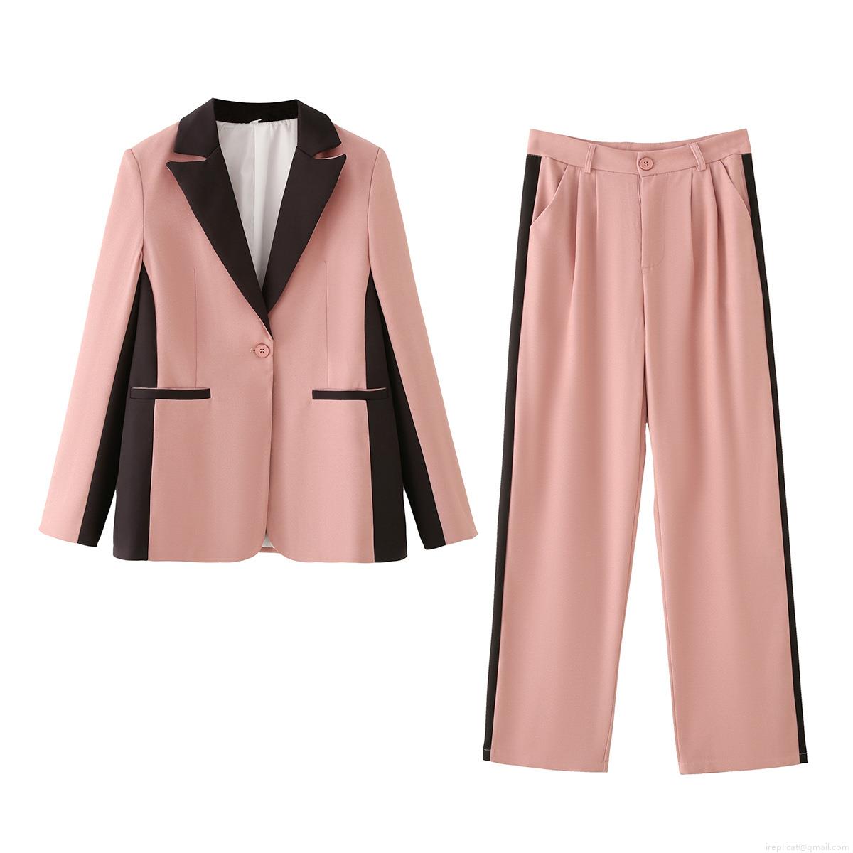 • Women Color Block Blazer And Pants Set Polyester Blend Contrast Trim Notch Lapel Single Button Suit Set Office Business Casual Western Style Streetwear Two Piece Outfits