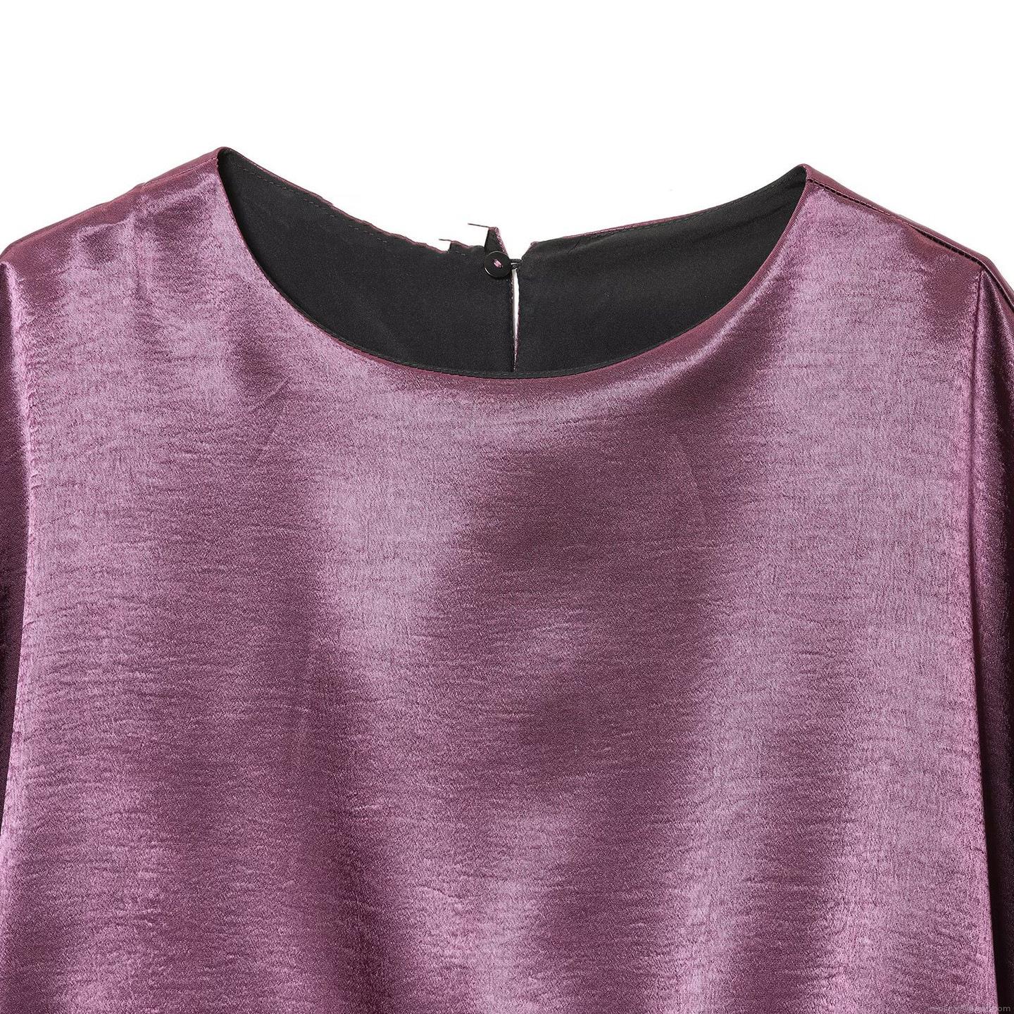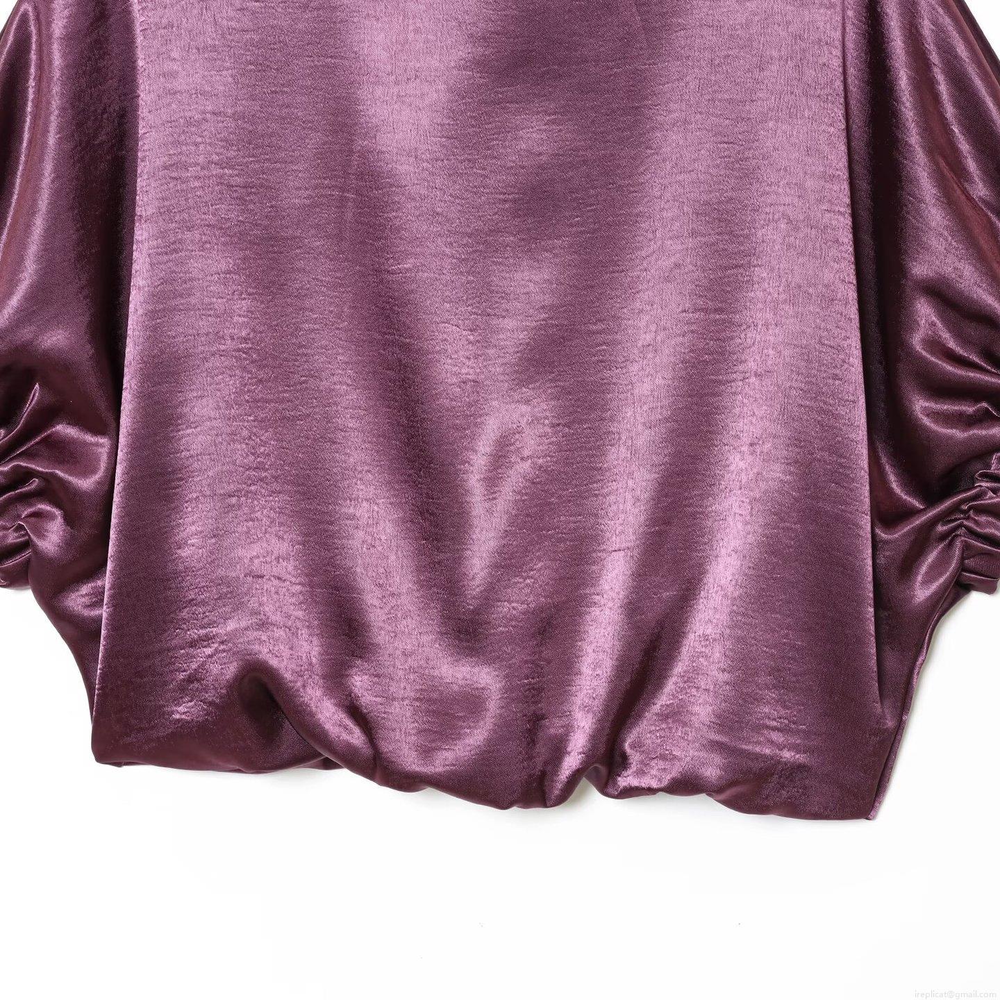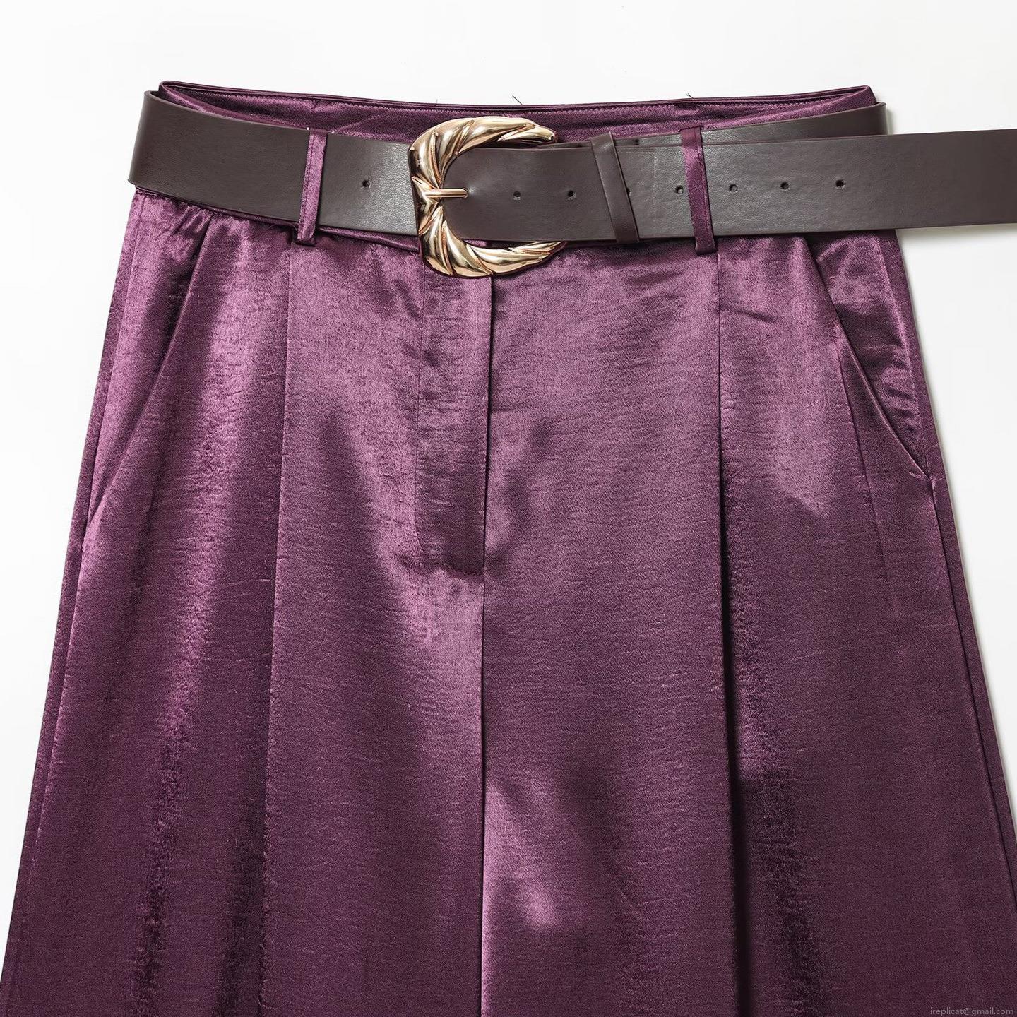 • Women Elegant Satin Two Piece Set Batwing Long Sleeve Top and High Waist Wide Leg Pants With Belt Solid Purple Silk Texture Casual Loungewear Set