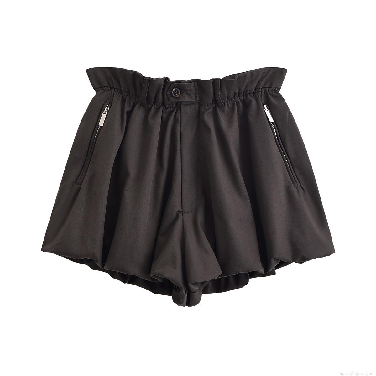 Solid Color, Pleats, High-waisted, Metal Zipper, Short Design, Contrasting Cuffs