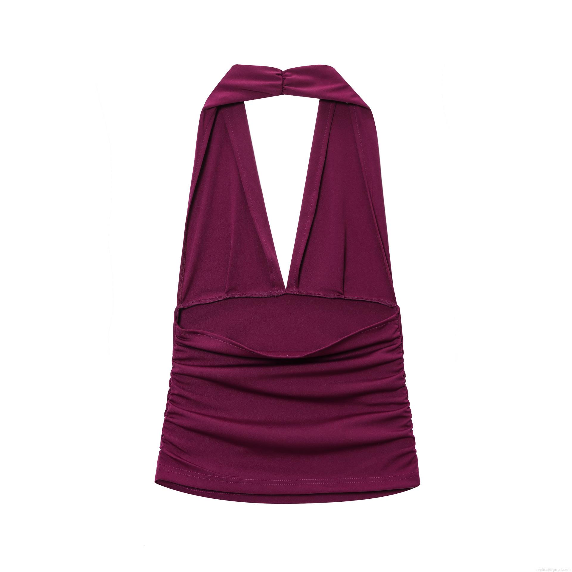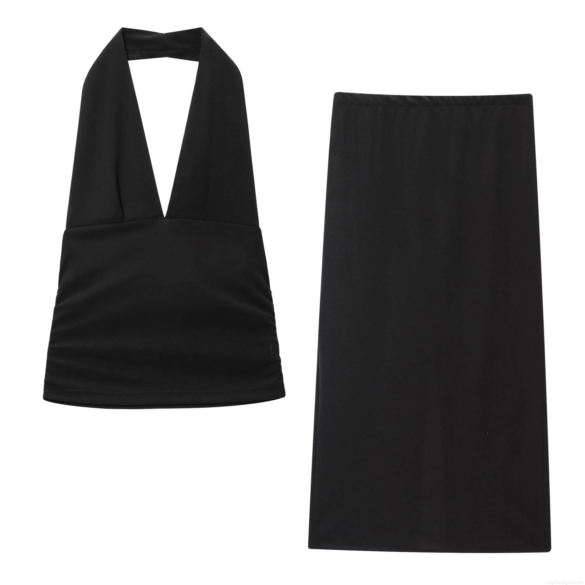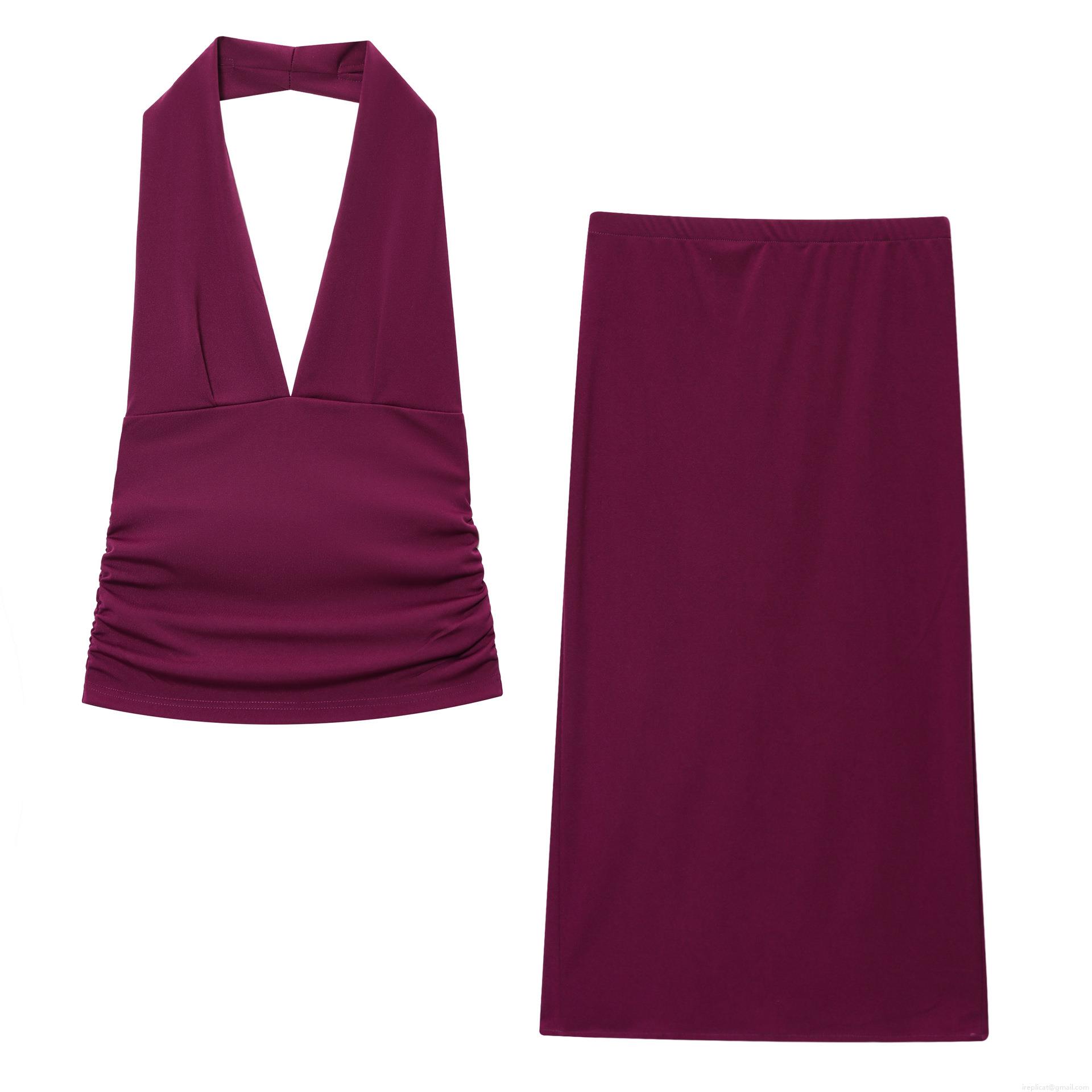 • Women Halter Neck Ruched Crop Top And Elastic Split Midi Skirt Two Piece Set Solid Color Sleeveless Deep V Neck Slim Fit Co-ords Streetwear Fashion Outfit