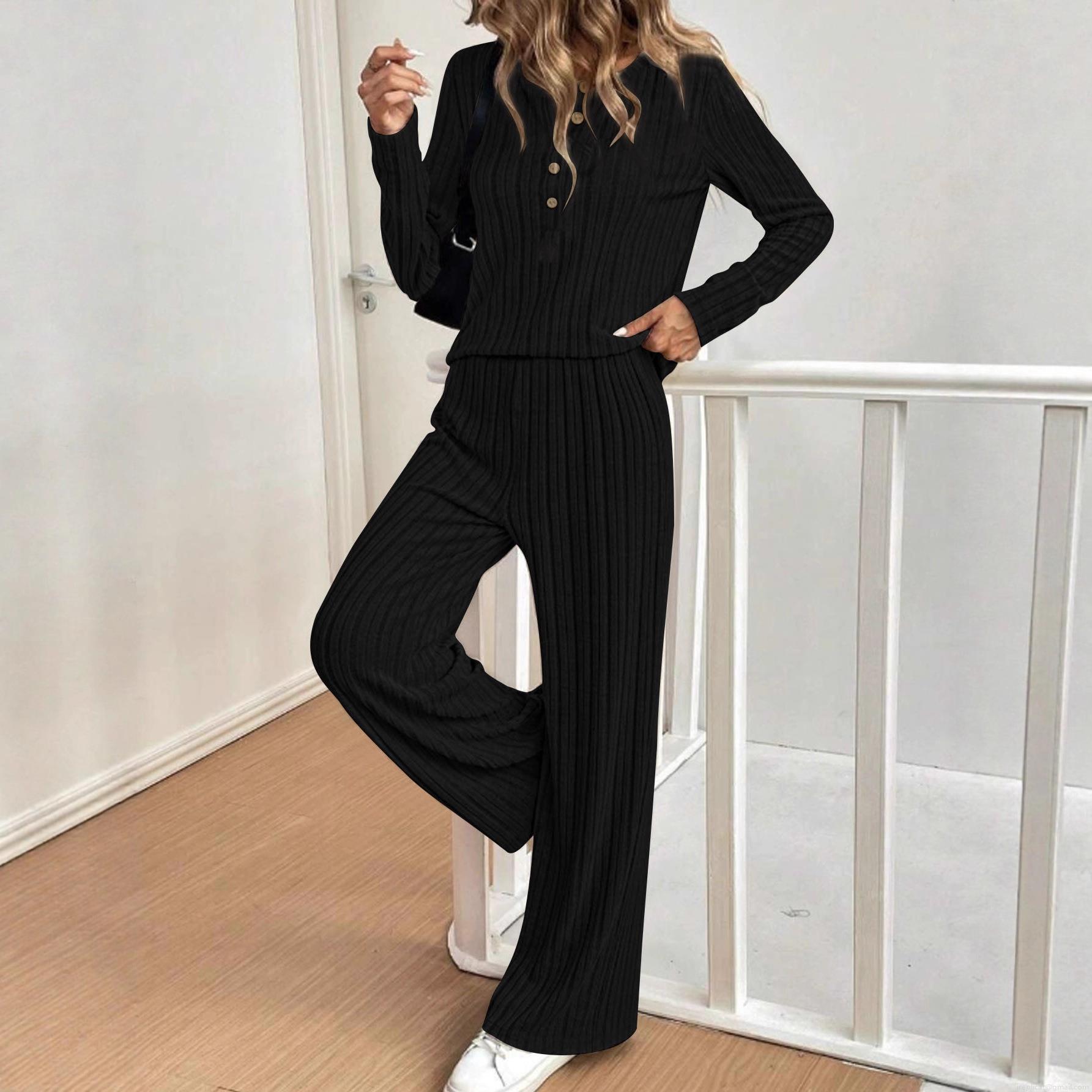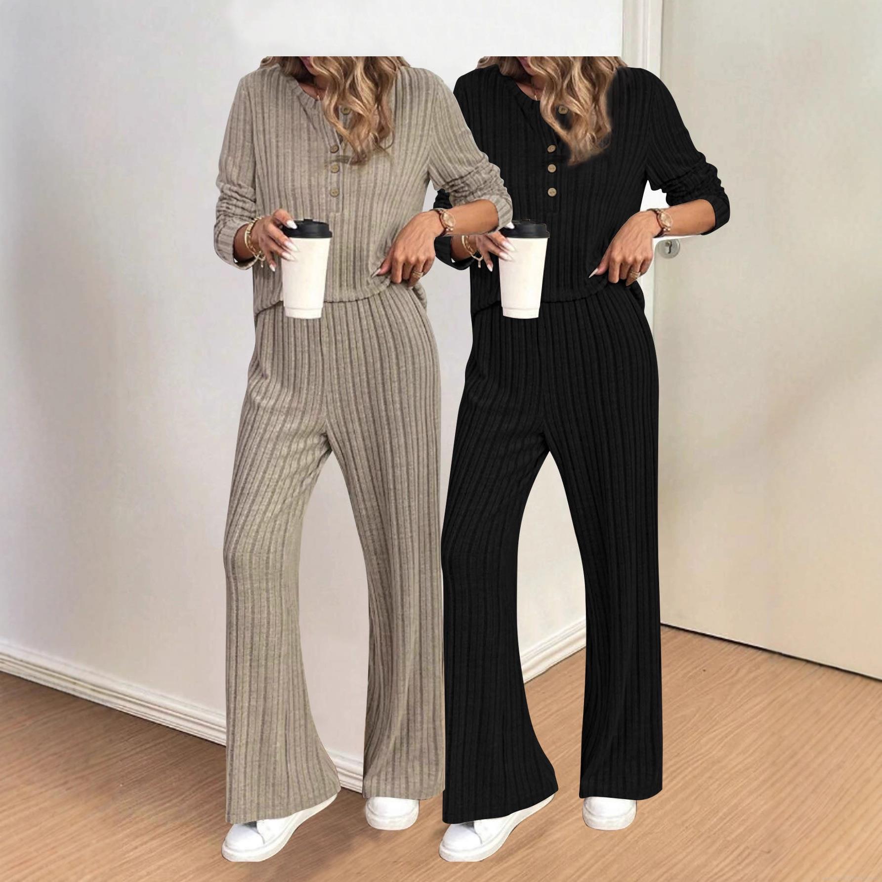 • Women Plus Size Autumn Winter Ribbed Knit Two Piece Set Casual Button Long Sleeve Top and High Waist Wide Leg Pants Loungewear Co-ord Set Outfit