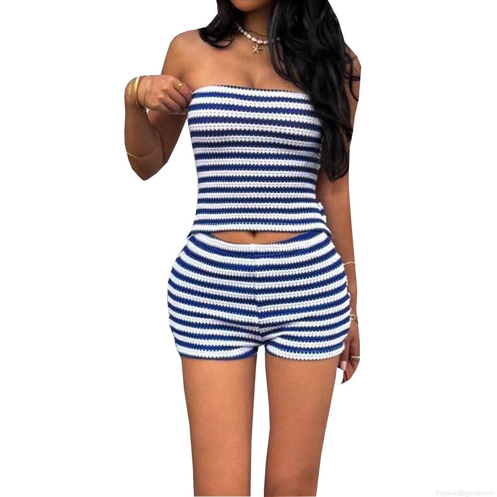 • Women Sexy Two Piece Knitted Set Blue White Striped Tube Top And Shorts Summer Beach Vacation Outfits Strapless Crop Top Mini Pants Suit