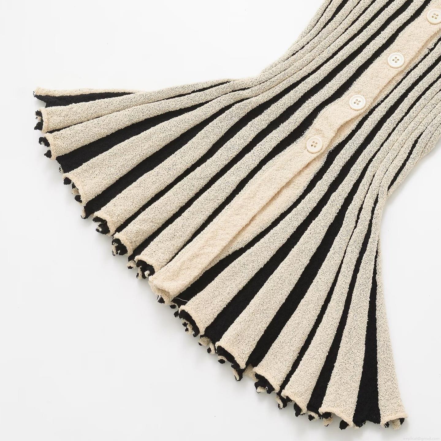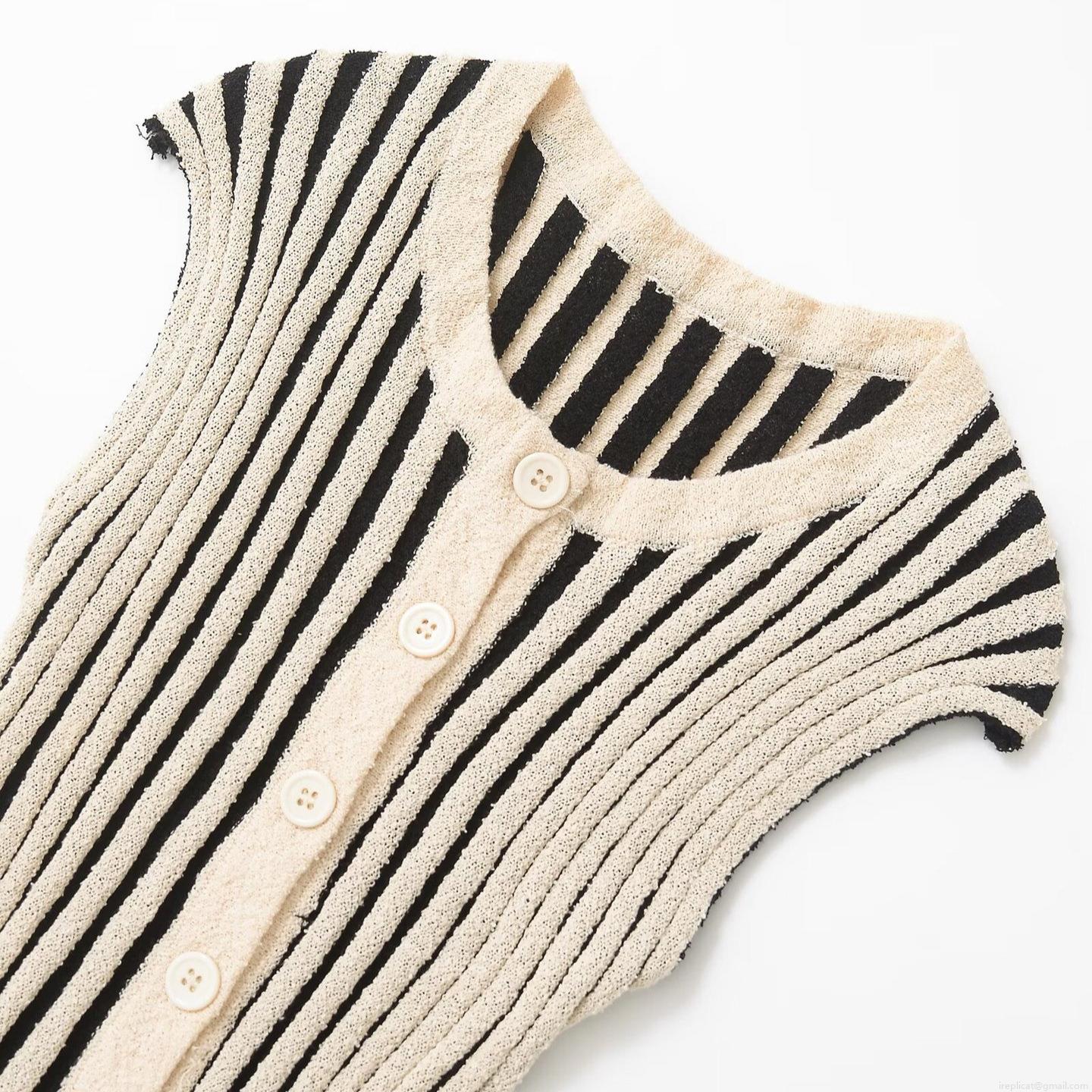 Women Striped Knit Two Piece Set Sleeveless Button Front Vest Top and High Waist Wide Leg Pants Casual Loungewear Outfit For Spring Summer