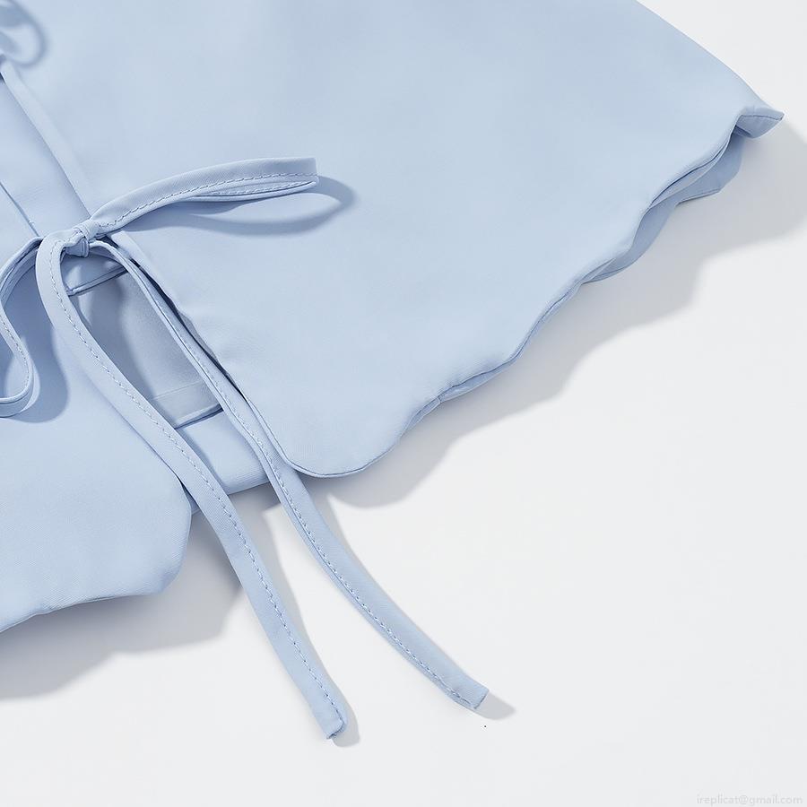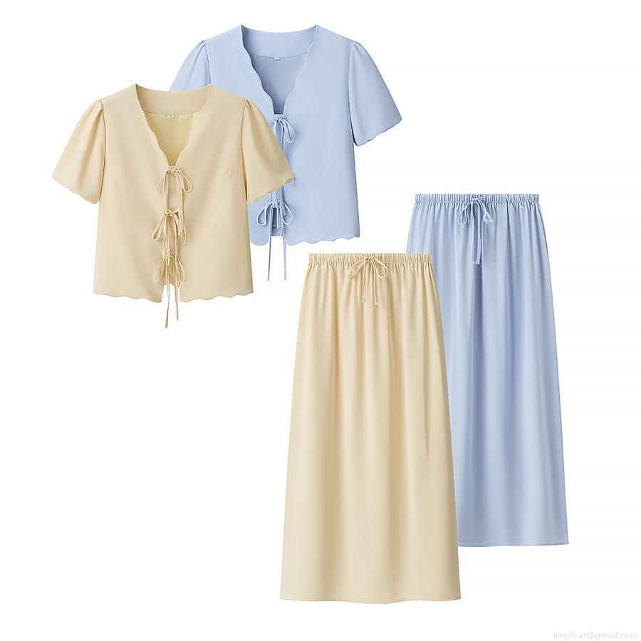 • Women Summer Scalloped Hem 2 Piece Outfits Sets Tie Up Short Sleeve V Neck Top With High Waist Elastic Shorts Or A-Line Midi Skirt Separates Loungewear