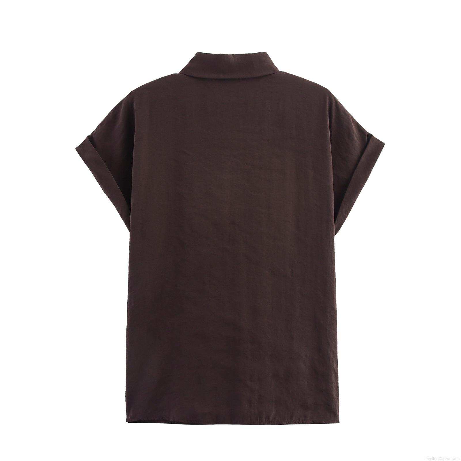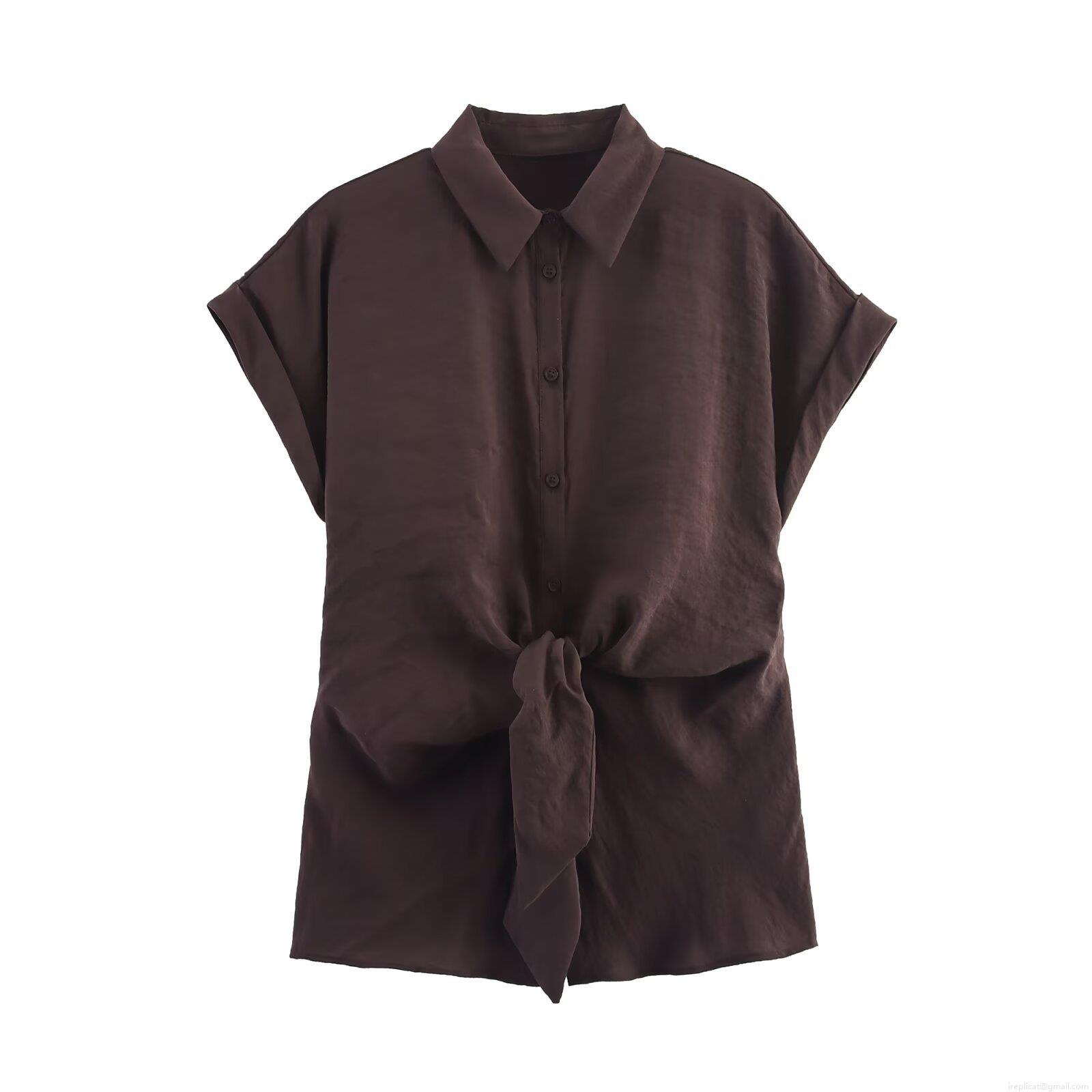 • Women Two Piece Set Casual Short Sleeve Tie Front Shirt And Wide Leg Pants Streetwear Solid Color Polyester Outfits With Waist Tie For Autumn Spring